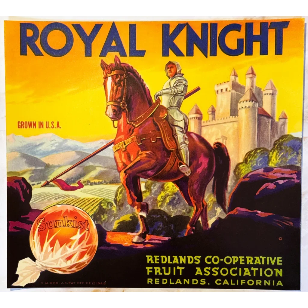 Whether you're a history buff, an art lover, or simply someone who appreciates the charm of vintage Americana, this Royal Knight Crate Label is sure to captivate and delight. Don't miss your chance to own a slice of California's citrus legacy – a time when oranges were king and Redlands was the crown jewel of the fruit-packing world!