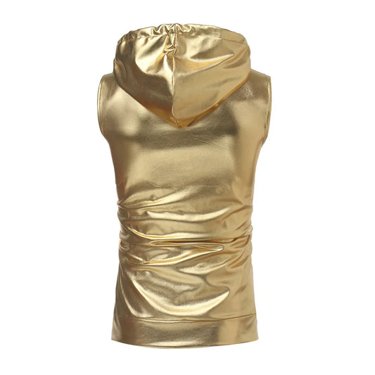 Hooded Men Shiny Gold Silver Zipper Nightclub Vest Men's Harajuku Streetwear Hip Hop Tops Dance Sleeveless Jackets Waistcoat