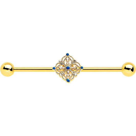 14G Blue Gem Gold Tone Texture Emblem Industrial Barbell 38mm