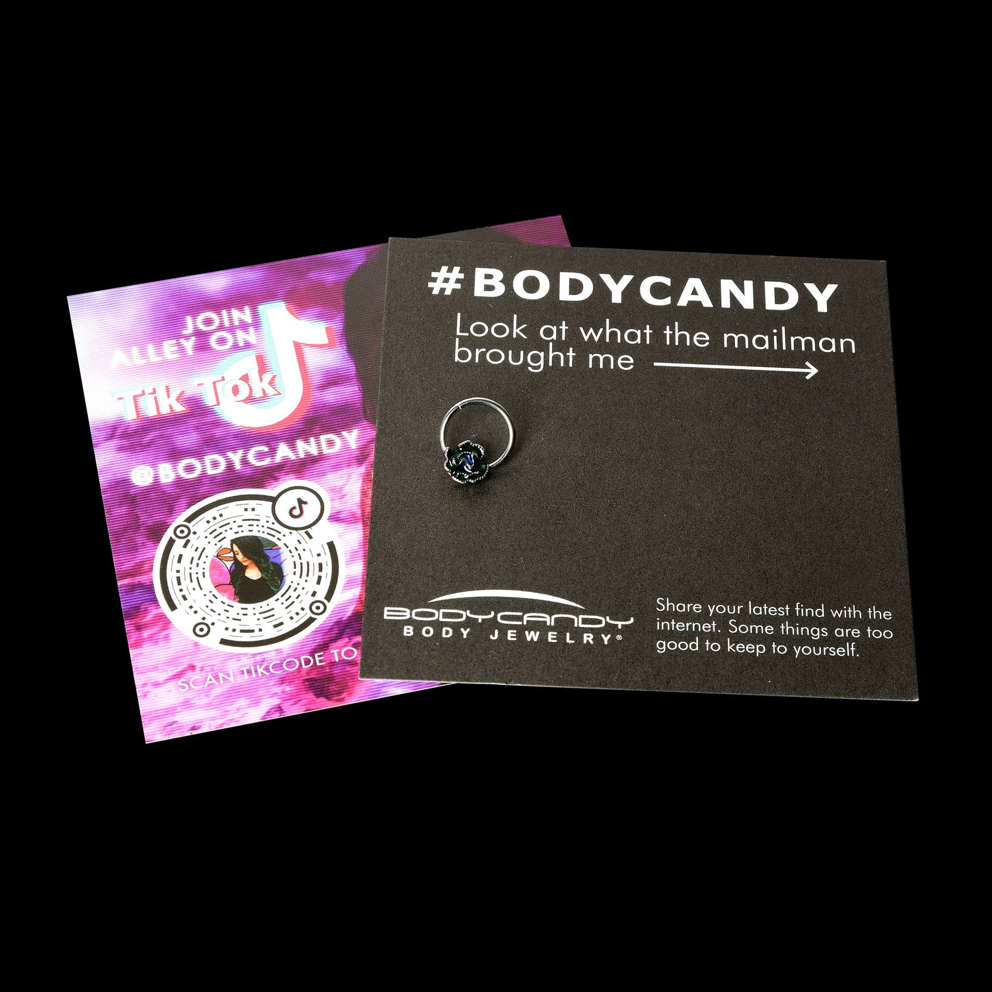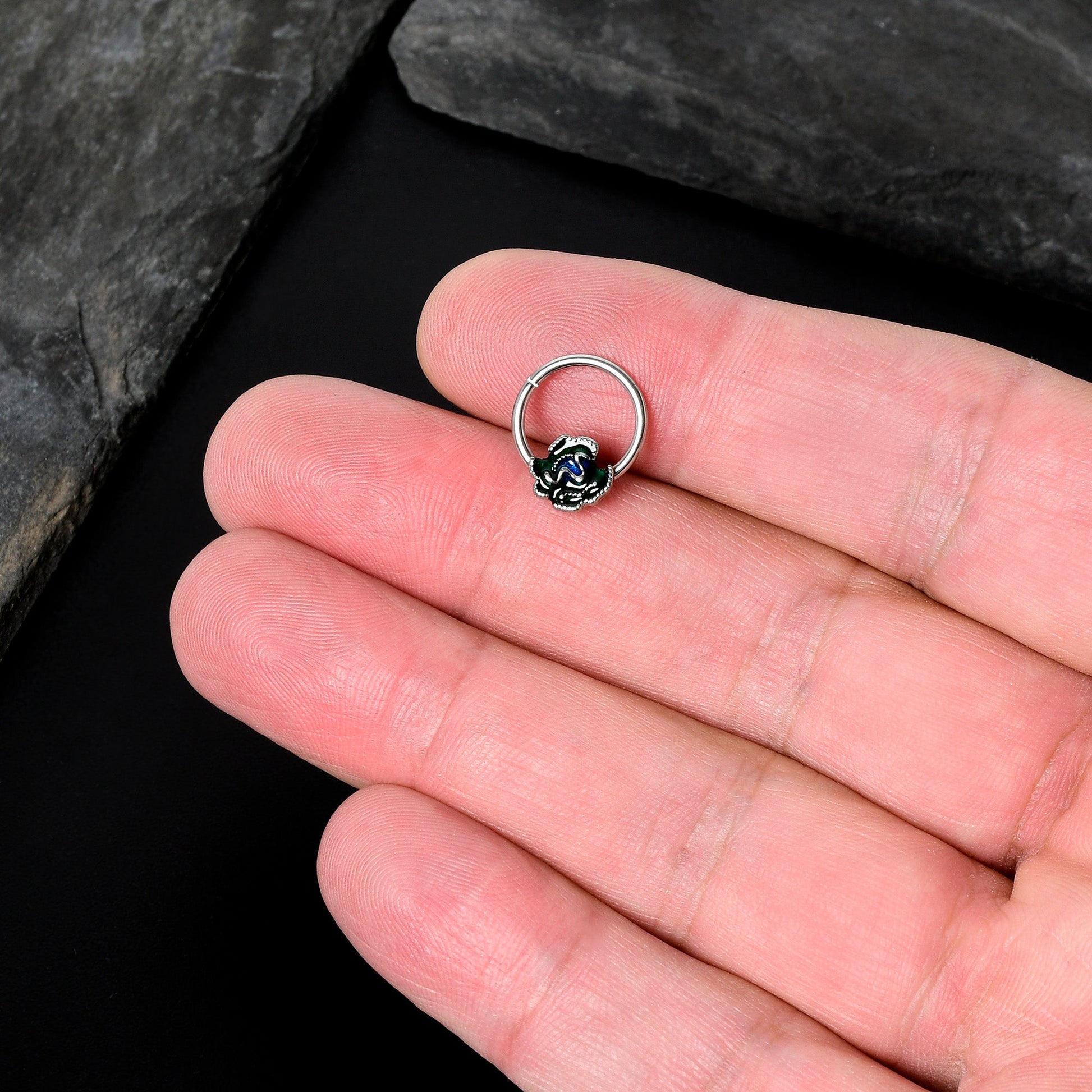It's always springtime when you're rocking this 16 gauge septum ring! It's made with a 10mm durable 316L surgical grade stainless steel hinged circular ring. It features a multi-dimensional flower charm, embellished with green and blue. It also features a non-removable, hinged segment that makes insertion and removal a breeze and you can even wear it in multiple piercings including tragus, helix, and some daith piercings. Let the flowers bloom with this floral cartilage piercing jewelry!