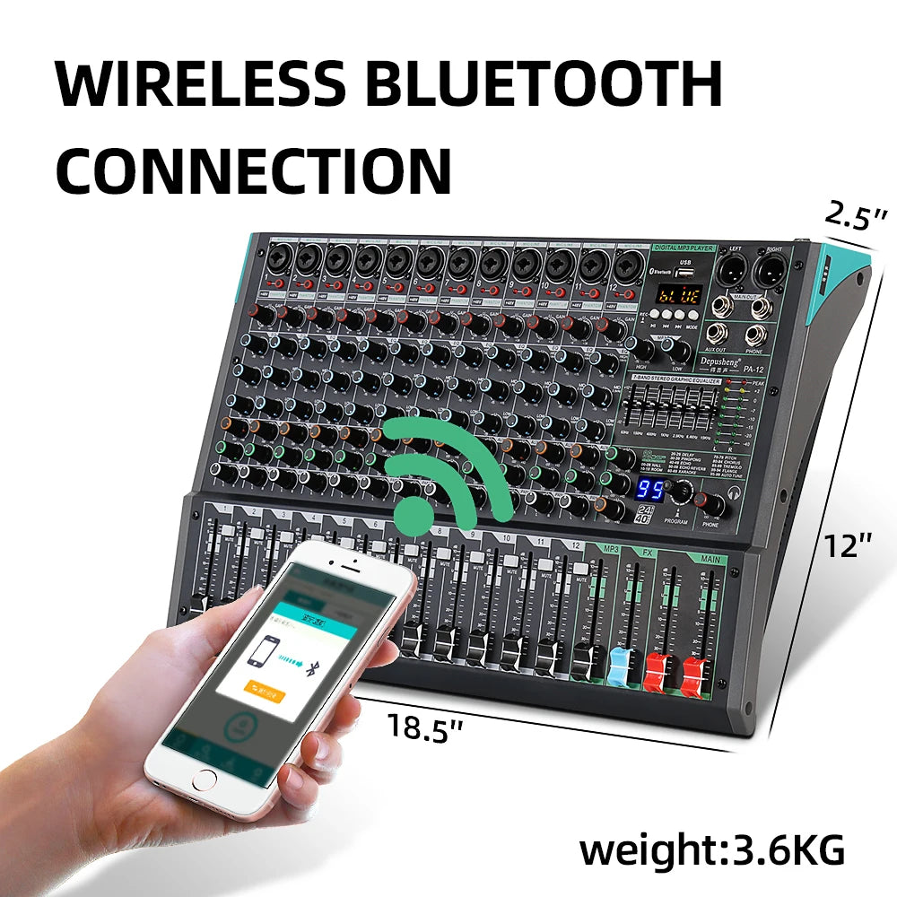 Depusheng PA12 Professional Audio Mixer Sound Board Console Desk System Interface 12 Channel Digital Built-in 99 Reverb Effect
