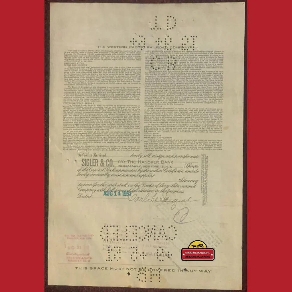 Prepare to be captivated by this extraordinary antique Western Pacific Railroad Company Stock Certificate Combo from the 1940s-50s! This isn't just any collectible – it's a gateway to the golden age of American railroads, a tangible piece of the pioneering spirit that built the West. Imagine holding in your hands the very document that once represented actual ownership in one of the most iconic railroad companies of the 20th century!