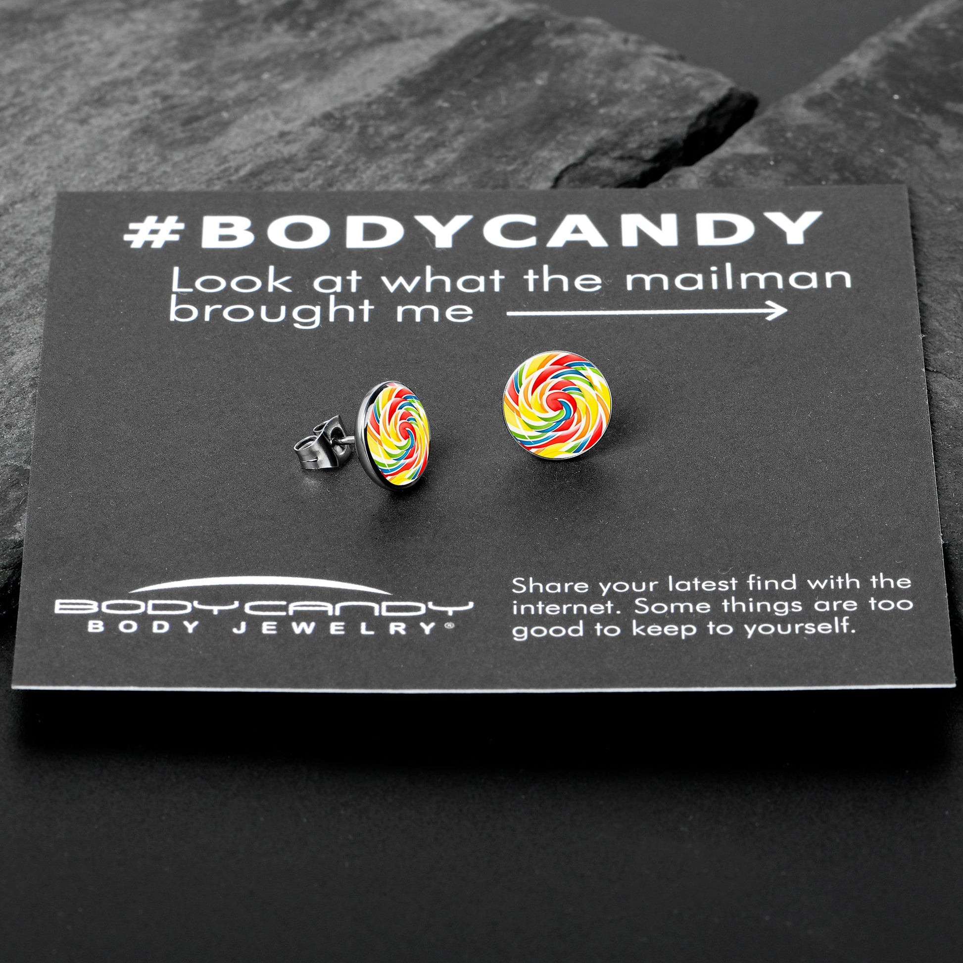 For a look so sweet you can not resist it, check out these lollipop earrings for pierced lobes. They feature rainbow swirl candy charms that look almost good enough to eat but are not actually edible. They are made with stainless steel straight posts with friction backs for a secure fit. For a candy color look that will make your head swirl, these lovely lollies are definitely the way to go. Sold as a set of two.
