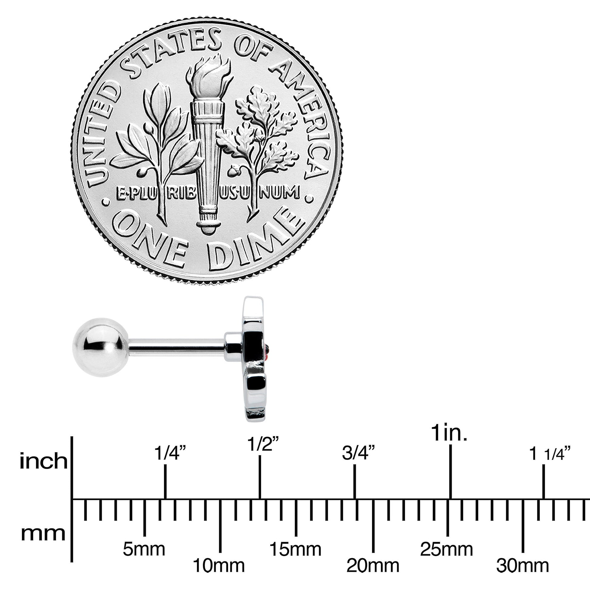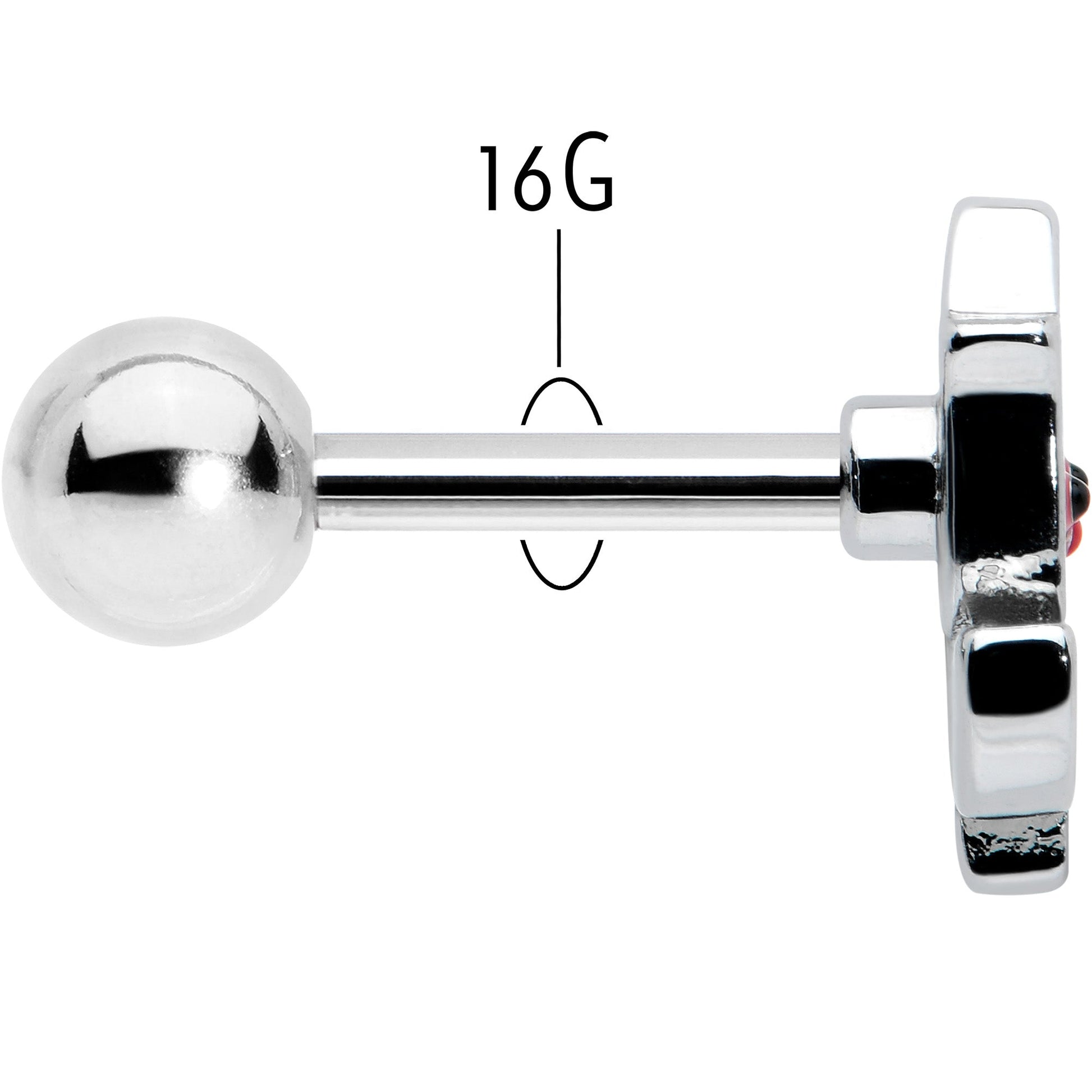 The rose on this 16 gauge tragus stud looks delighted to be adorning your piercings! It's made with a 6mm durable 316L surgical grade stainless steel straight barbell with a 4mm ball end. It features a rose flower charm, with a red inlaid blossom and green inlaid leaves and stem. It also features a cheerful face on the blossom portion, for a truly winsome touch. You can even rock it in multiple piercings including tragus, helix, and some conch piercings. Rise to every occasion with with this endearing floral cartilage piercing ring!Specifications