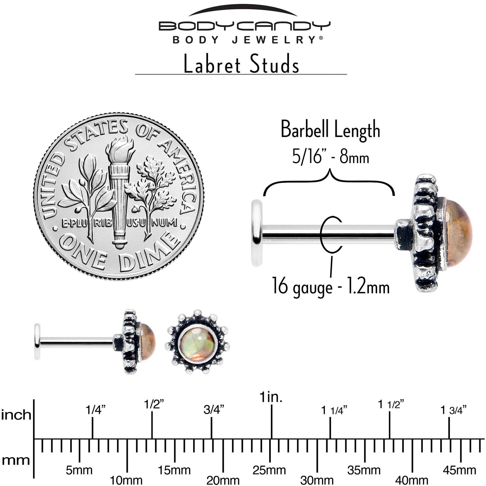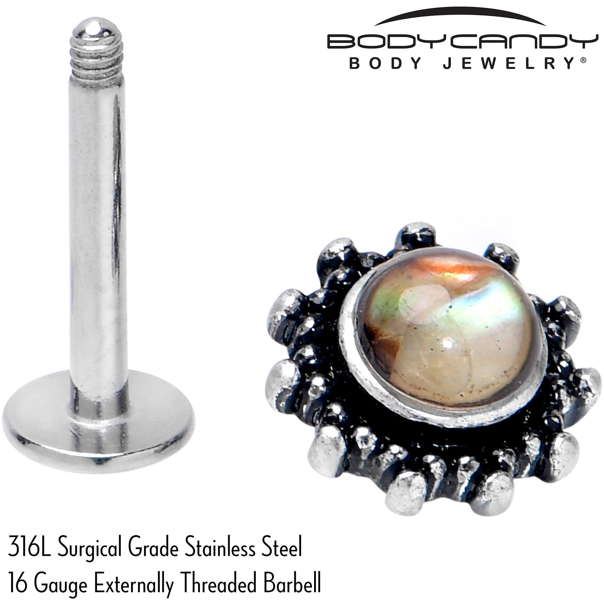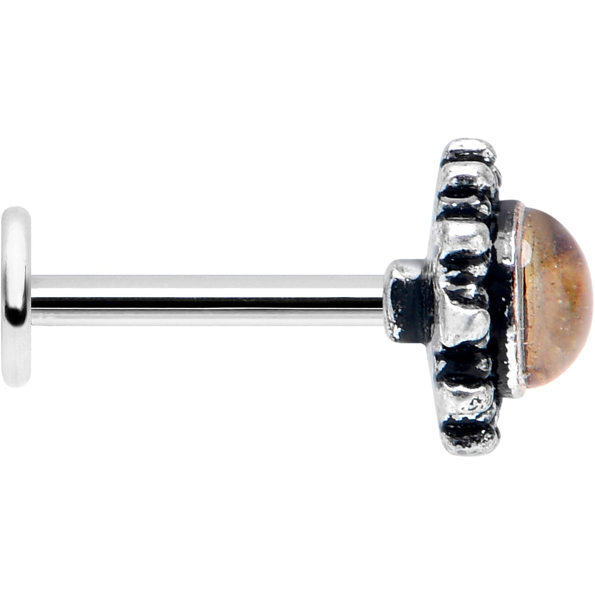 Join the circle of fabulous with this 16 gauge lip ring. It is made with an 8mm durable 316L surgical grade stainless steel straight post with a flat disc end. It features a round charm, with a brown faux shell center and textured embellishment along the edges. You can even rock it in multiple piercings including lip, monroe, tragus, helix, and some conch piercings. Be in the inner circle of style with this simply fabulous cartilage piercing jewelry.