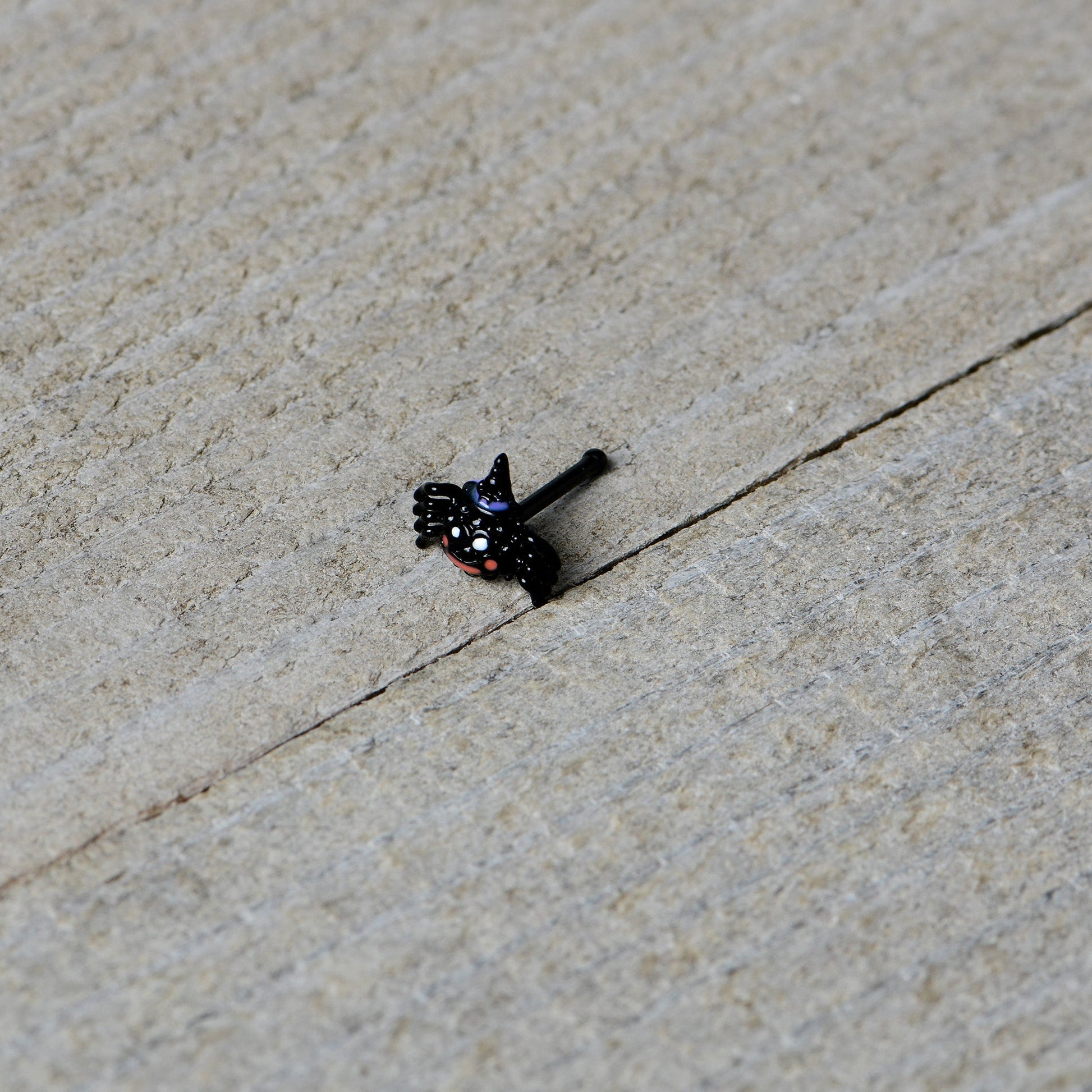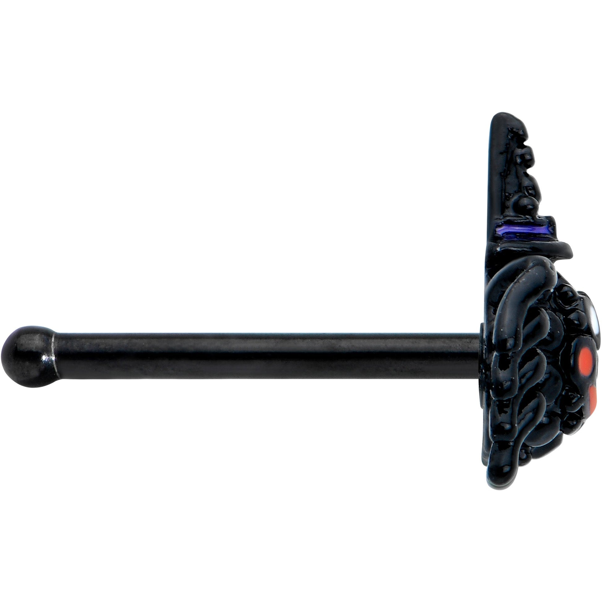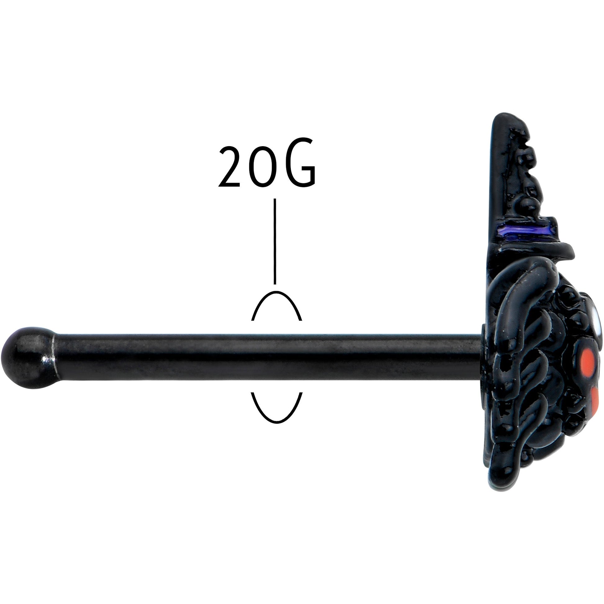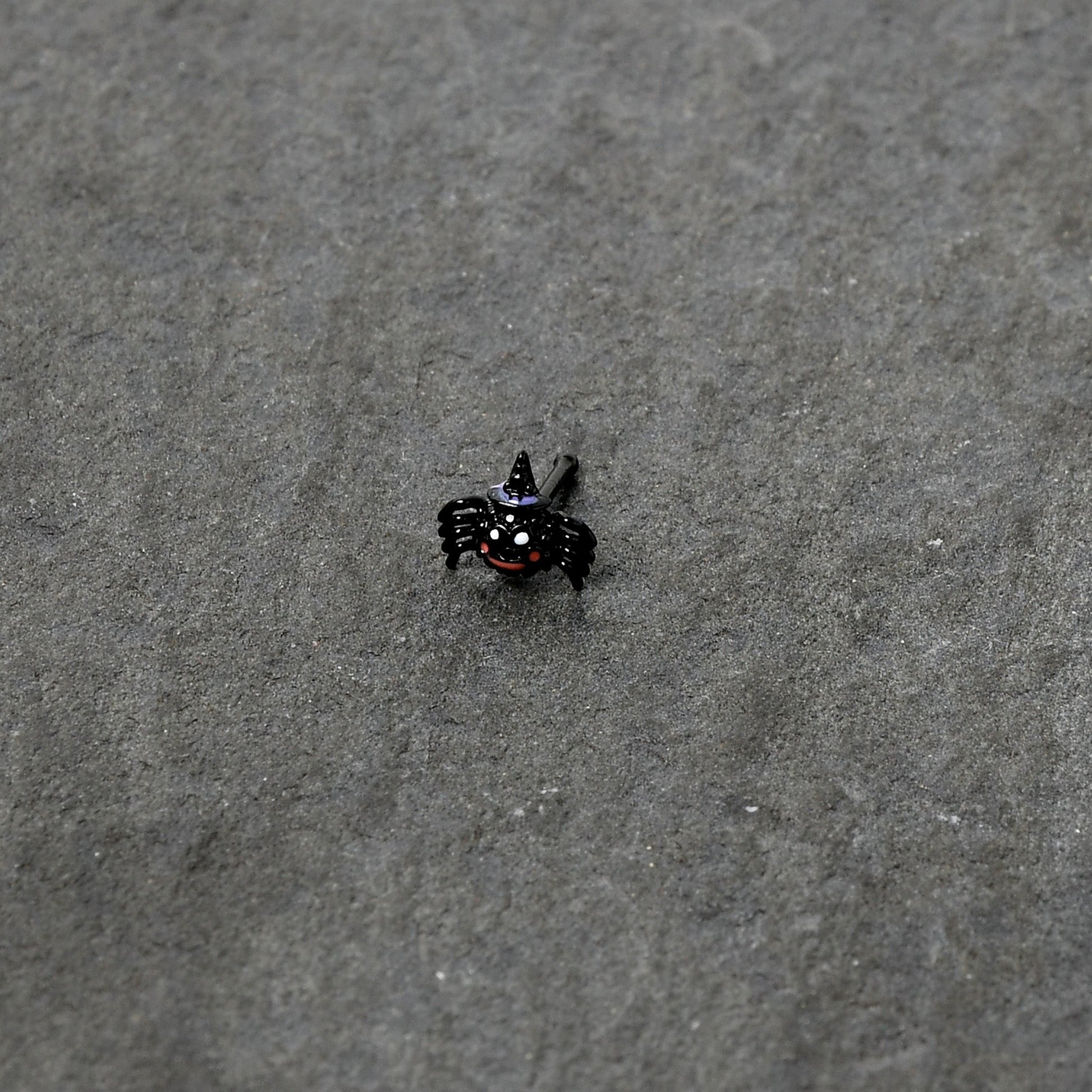 The spider on this 20 gauge nostril ring is sure to cast a spell on you! It's made with a 6mm black PVD over 316L surgical grade stainless steel straight post. It features a witchy spider charm, complete with a purple embellished pointy hat, and a sweet smiling expression. Let this eight-legged Halloween honey cast its spell on you with this endearingly whimsical nose piercing jewelry!Specifications