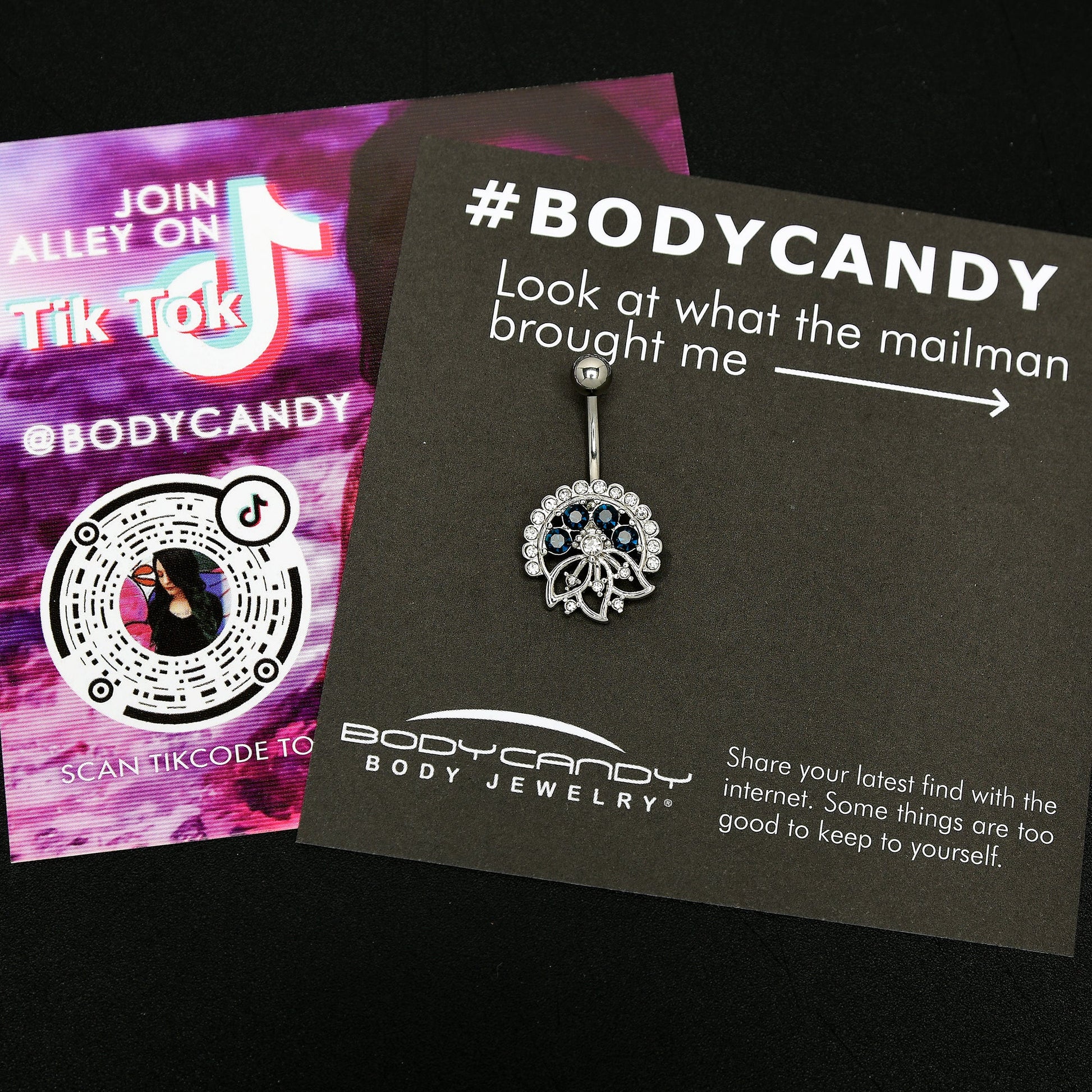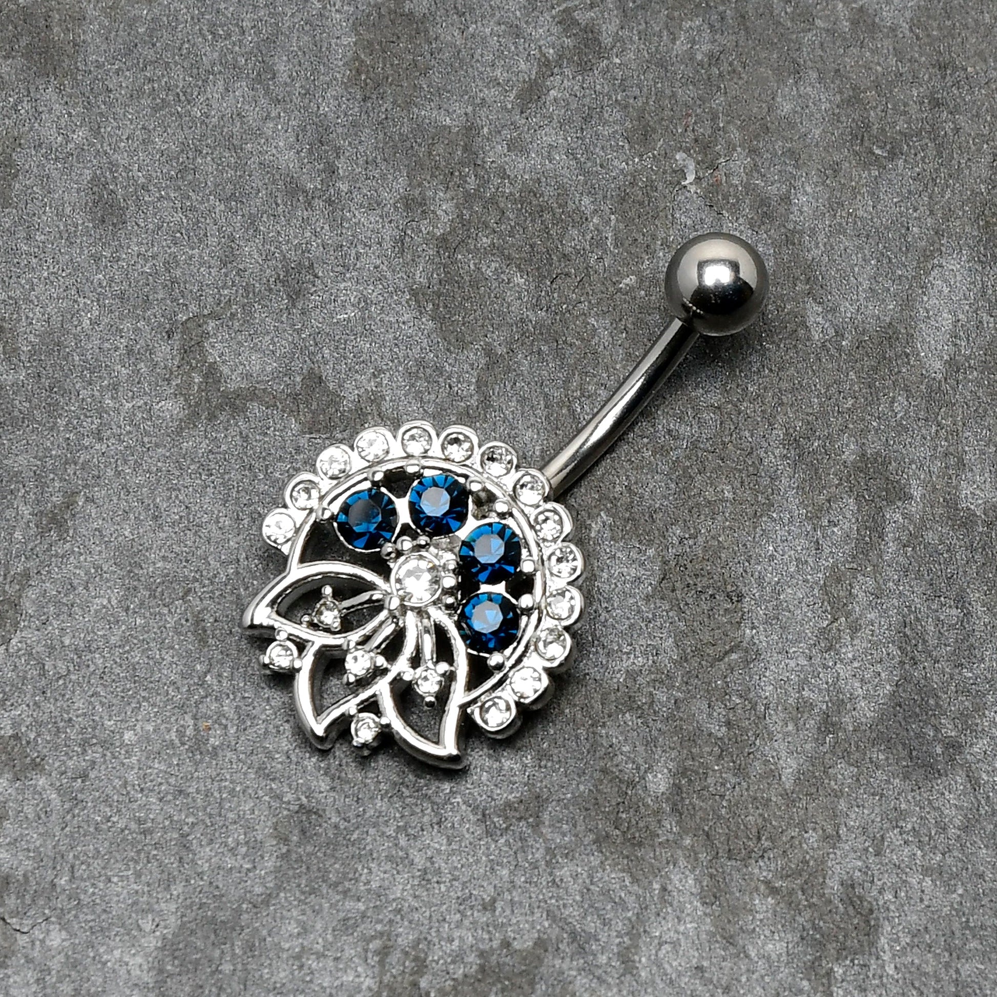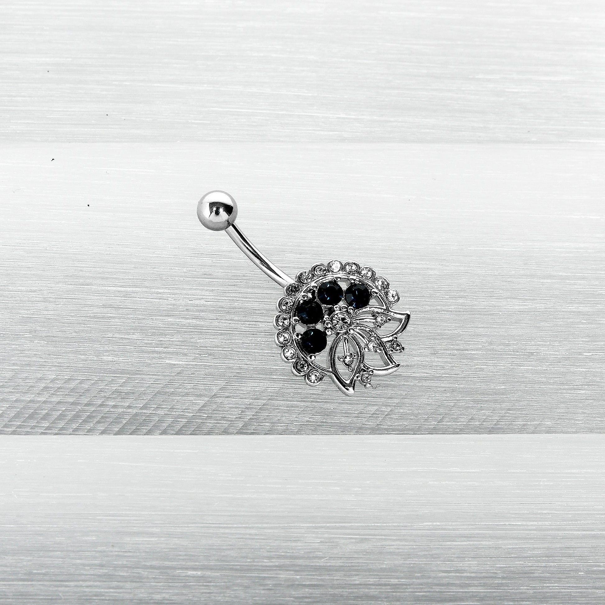 The curve on this 14 gauge navel ring is sure to catch eyes! It's made with a 3/8" durable 316L surgical grade stainless steel curved barbell with a 5mm top ball end. The bottom end features an abstract arch charm, with the outermost rim set with clear gems and the inner curve set with deep blue gems. Below that is an abstract flower design with more clear gem embellishments. Get abstract with this elegant belly piercing ring!