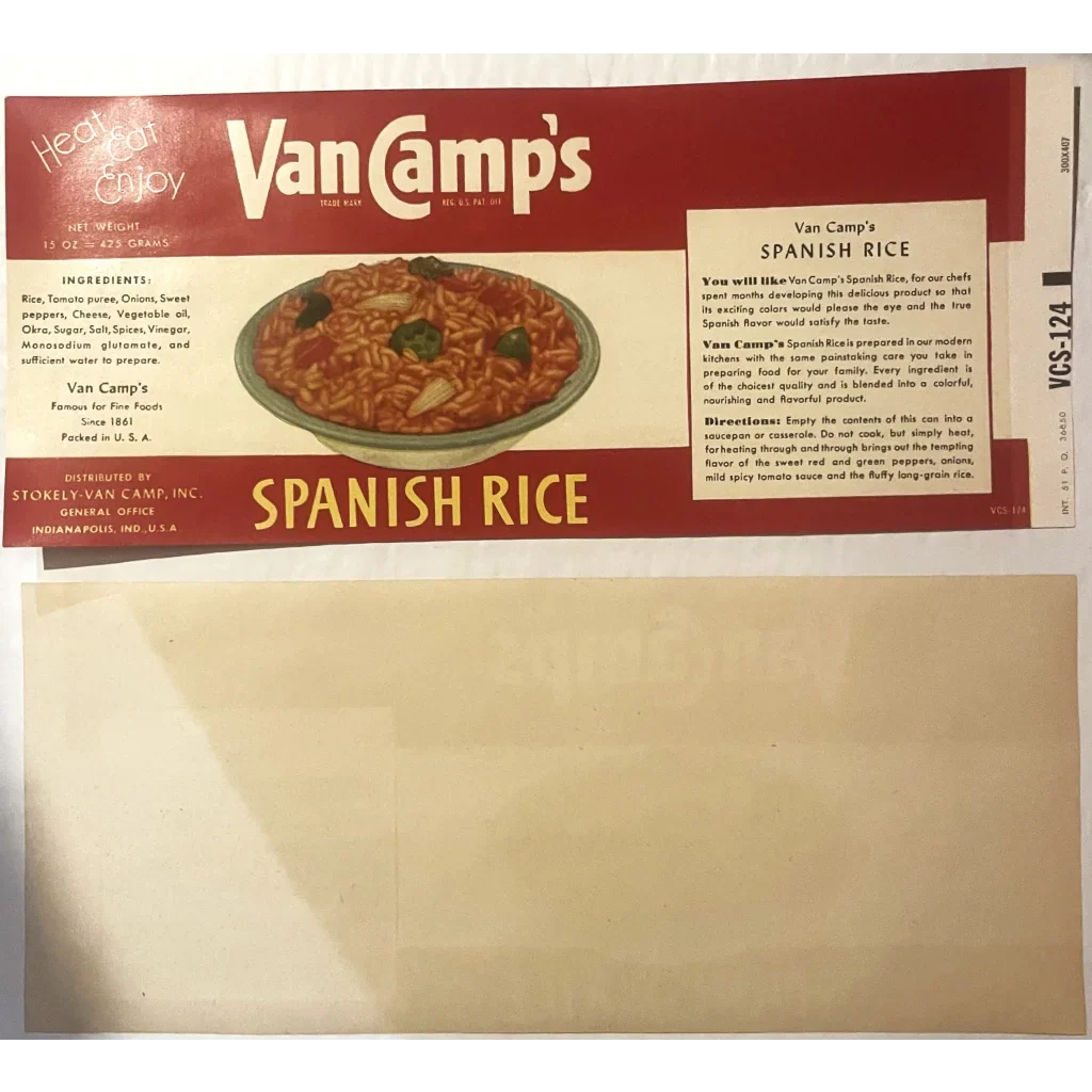 But there's more to this Spanish rice label than meets the eye! Van Camp's rich history dates back to the Civil War era, where their hearty provisions sustained troops on the battlefield and comforted veterans upon their return home. The company's innovative spirit shone through in 1861 when they pioneered the first successful commercial cold storage warehouse - a game-changer in food preservation!
