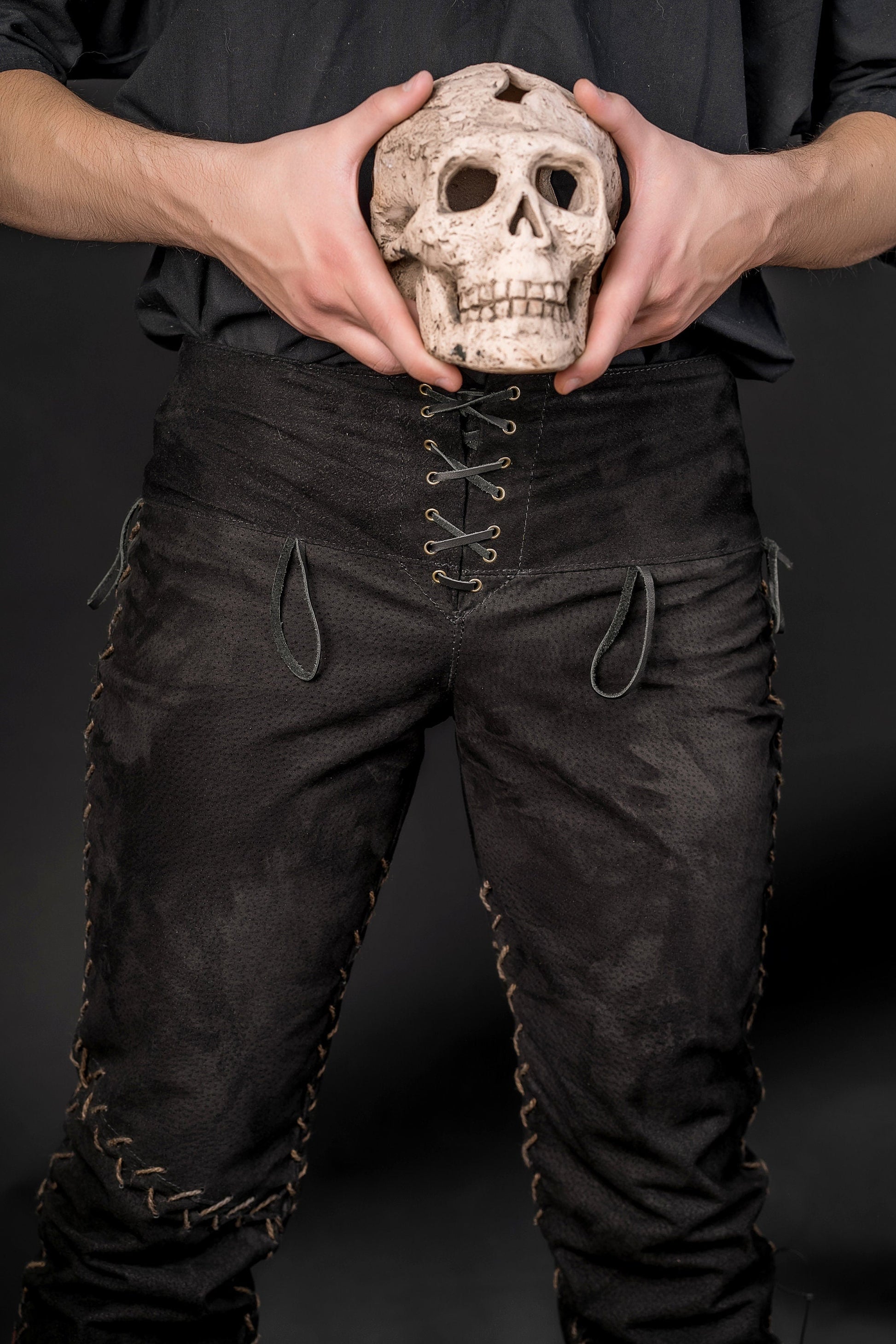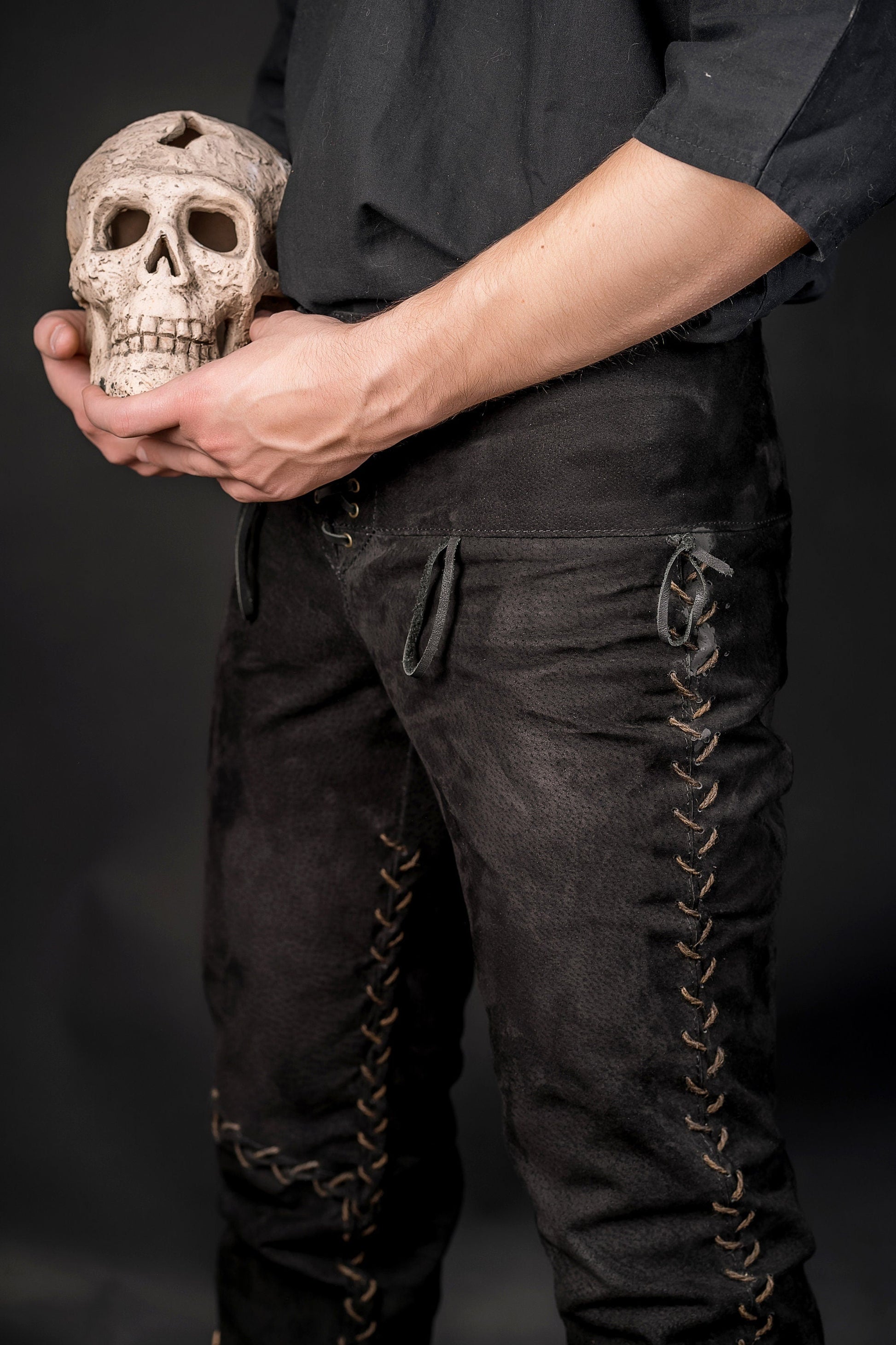 Leather pants for LARP or Cosplay made by SokolWorkshop. Imagined and created by our leather team Аrtificial aging creates the effect of old age.
