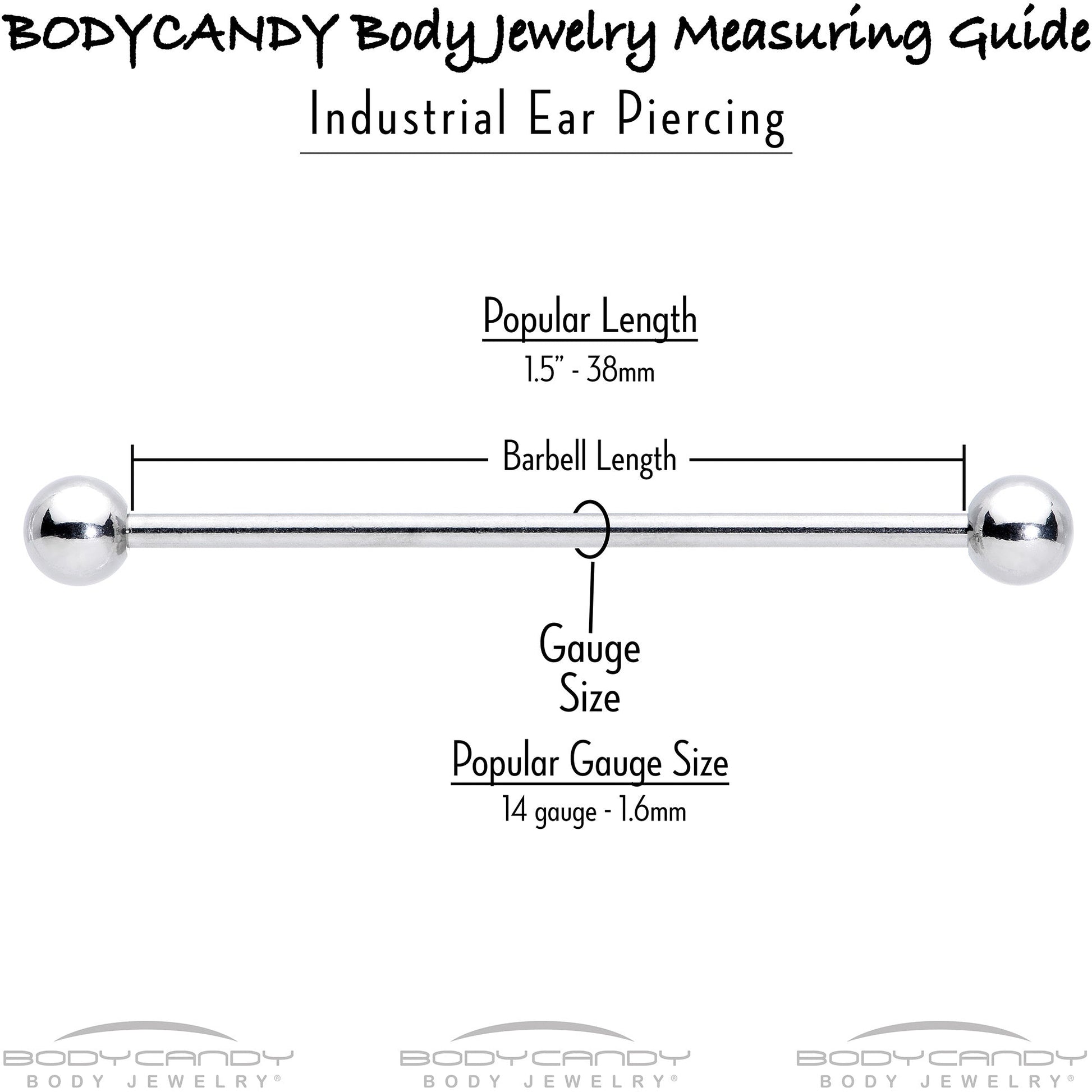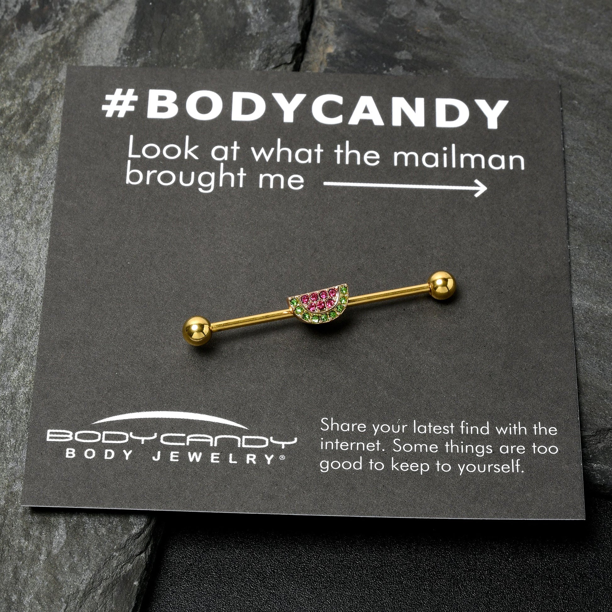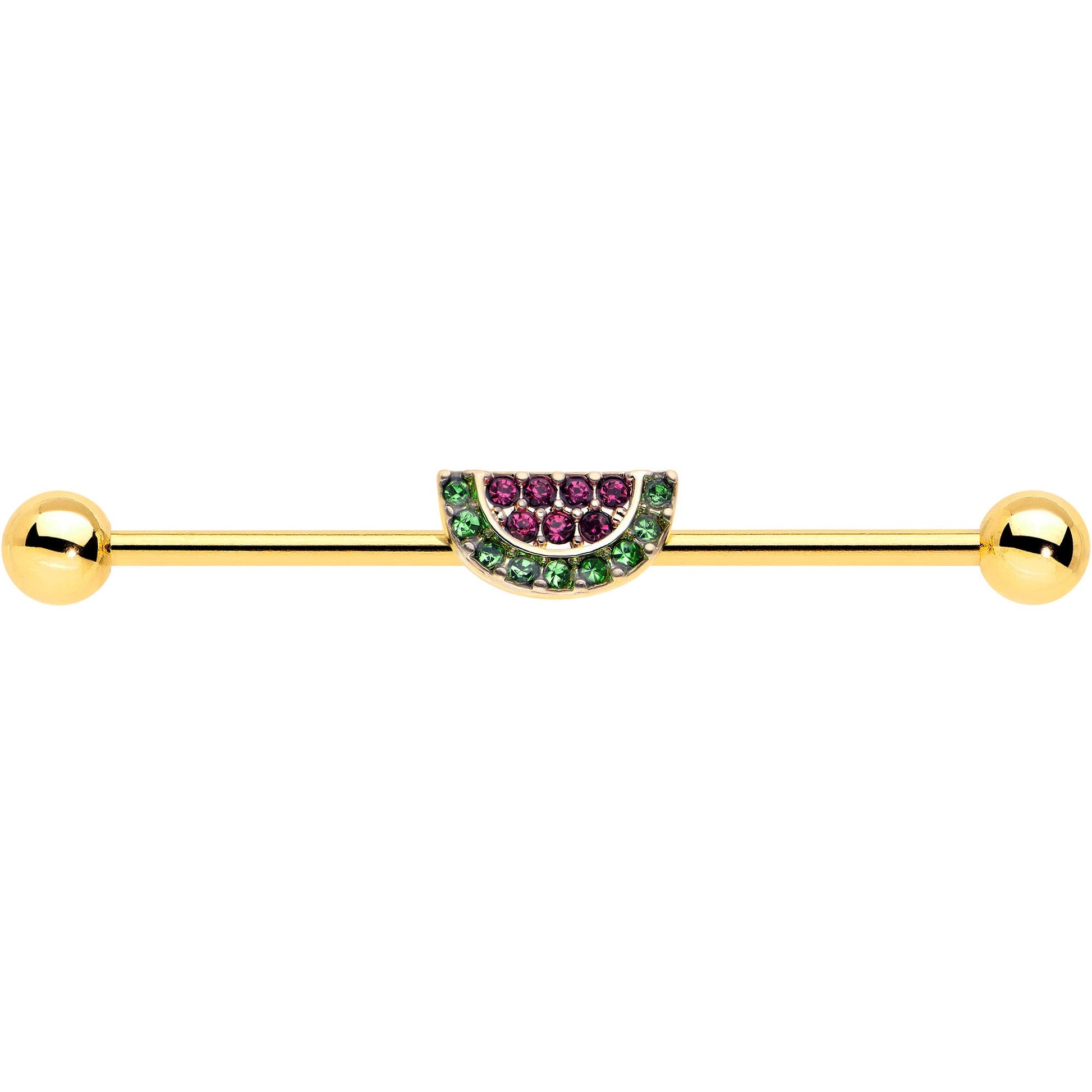 Your industrial piercing will look downright delicious when you are wearing this 14 gauge helix barbell. It is made with a 1 1/2 inch gold tone PVD over 316L surgical grade stainless steel straight barbell with 5mm ball ends. It features a wedge of watermelon charm, paved in green and pink gems. You can slide it up and down the length of the barbell for the perfect look. Get a tasty summer look with this wonderful watermelon barbell earring.Specifications