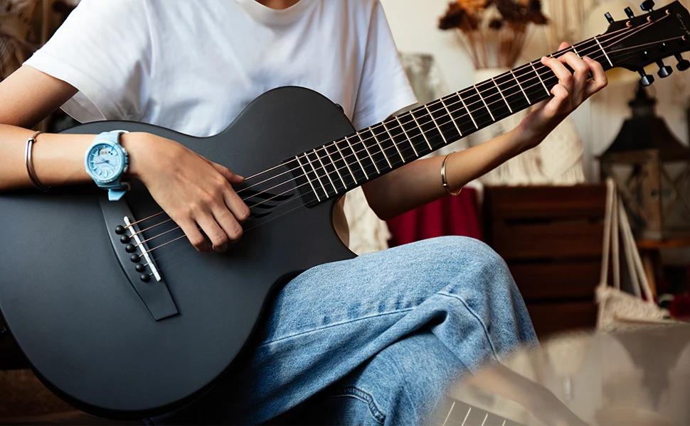 Nova Go is made of carbon fiber composite material, which means it's impervious to temperature and humidity change. Taking it to chill on a beach with the hot bright sun up above, or to a hiking trip deep in a mountain, or even further to shoot some beautiful Instagram posts in a snow land, Nova Go would stay stable, with no warp nor cracks. That's the edge of carbon fiber acoustic guitars.