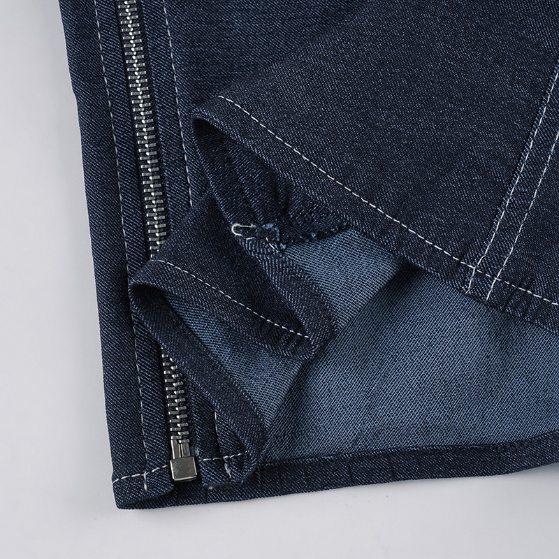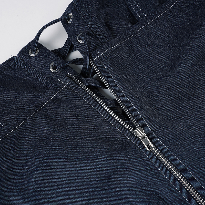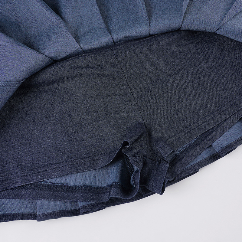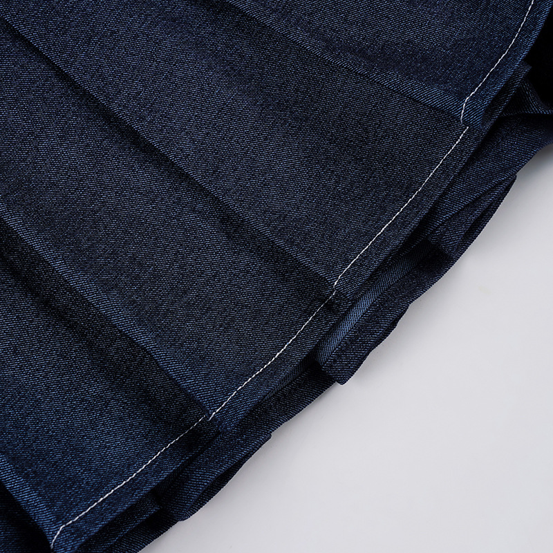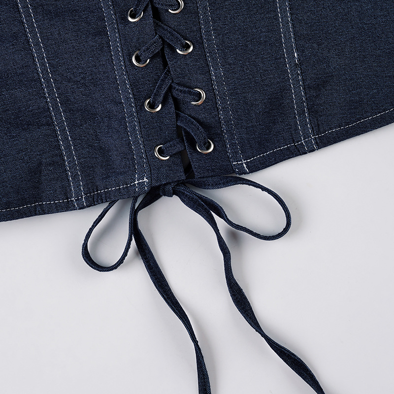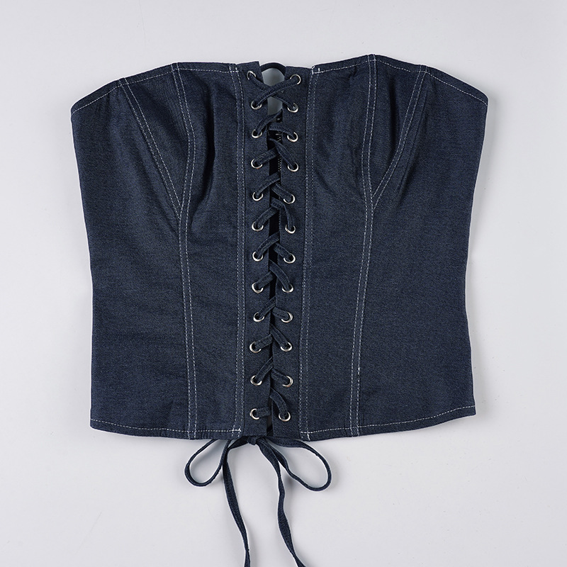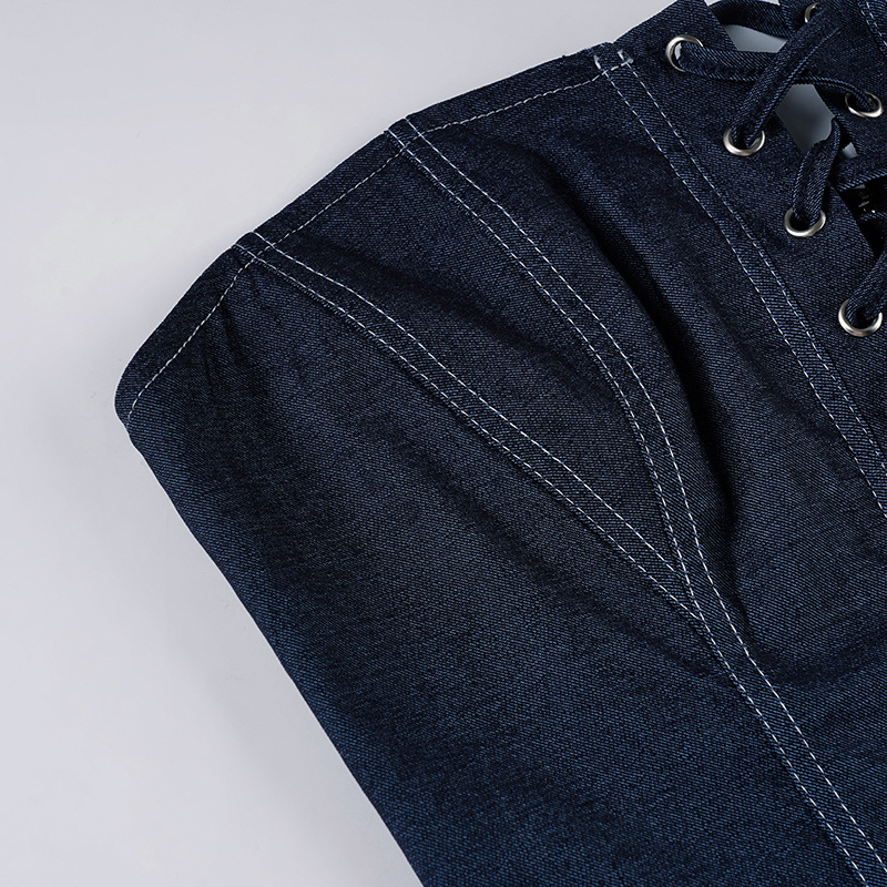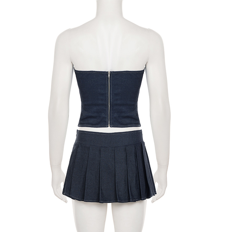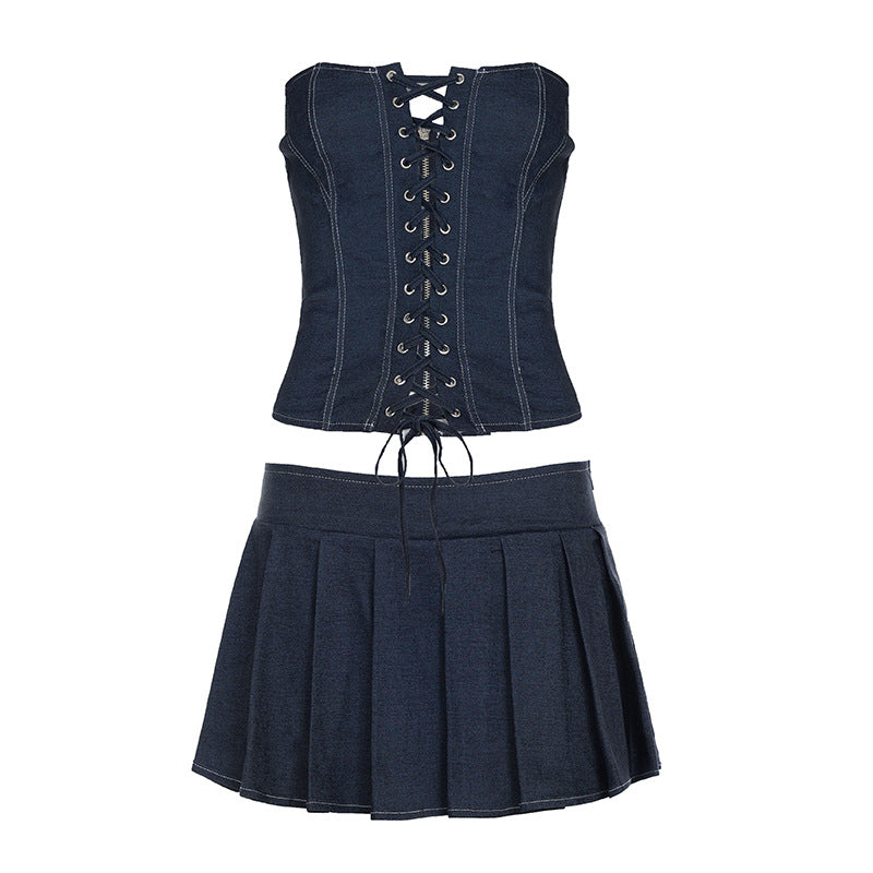 Self Built Solid Color Sexy Lace up Tube Top Sexy Pleated Skirt Imitation Denim Two Piece Sets