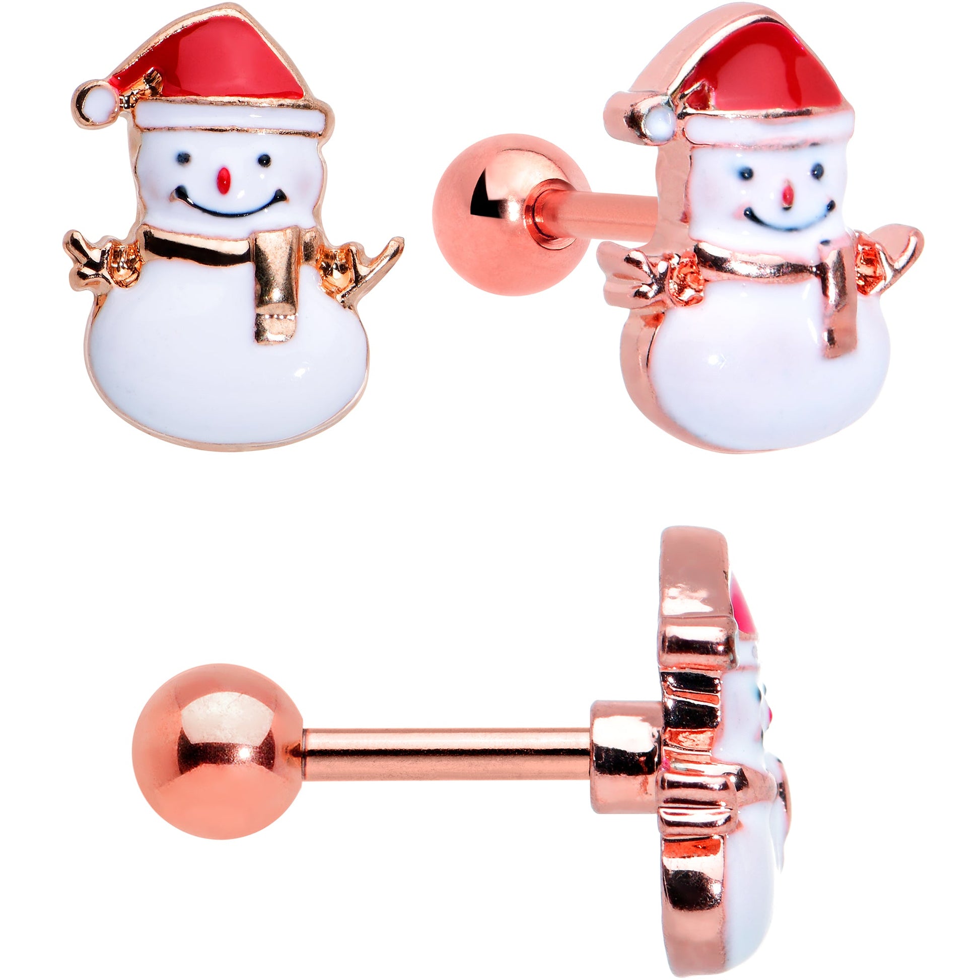 You'll have all the days of Christmas covered with this set of 16 gauge cartilage studs! They are made with 6mm rose gold tone PVD over 316L surgical grade stainless steel straight barbells with 4mm ball ends. One features a Christmas tree charm, embellished with red gem ornaments and a green star topper. The second features a snowman charm, wearing a jaunty red hat and a happy smile. The third features a ball ends in festive red. You can even rock these rings in multiple piercings including tragus, helix, and some conch piercings. You'll be all dressed for the season and ready to go with this festive set of tragus studs! Sold as a set of three.