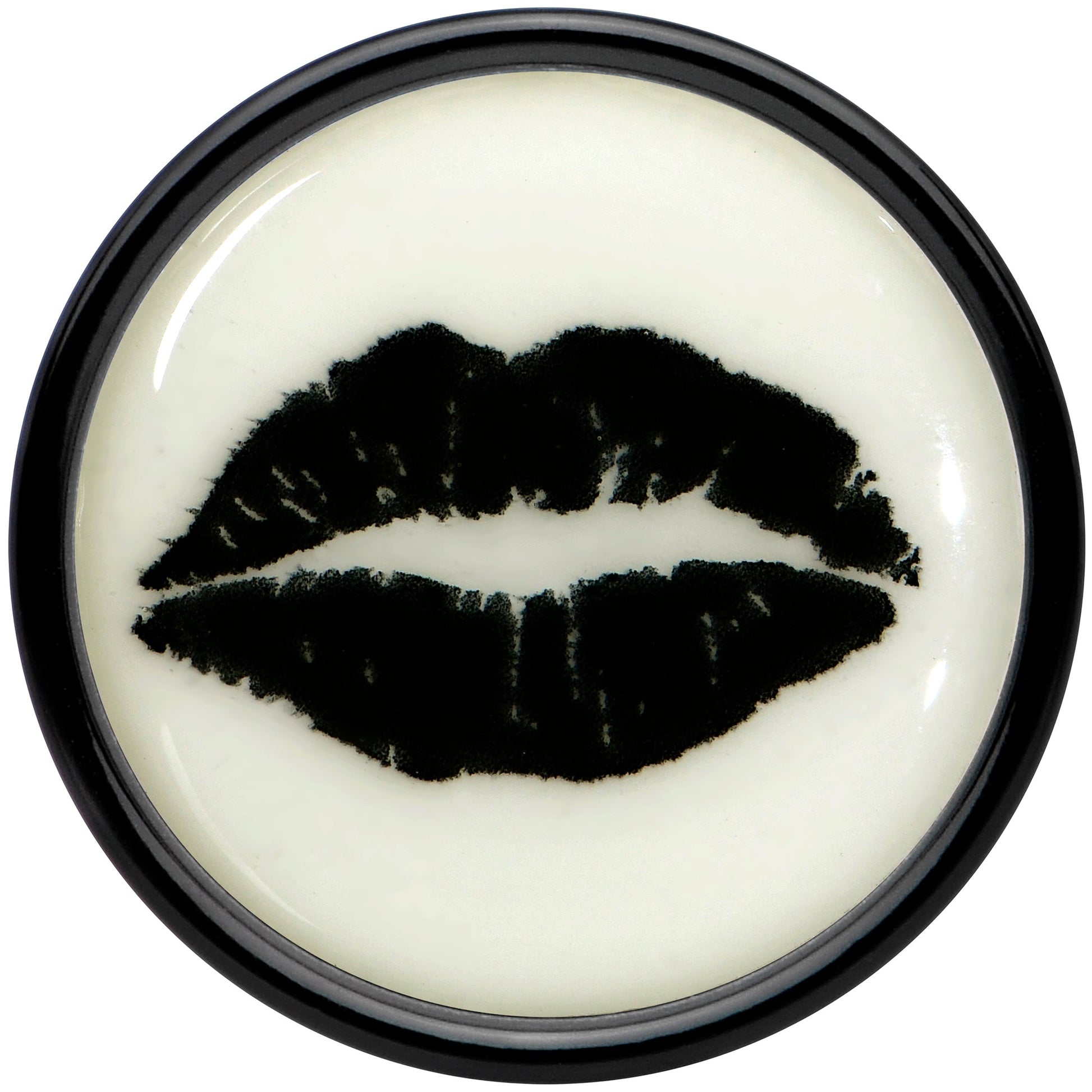 Give your look a great big kiss of style with these plugs for stretched lobes. They are made with acrylic and feature a double flare design for secure wear. Each one features a black kiss mark on a glow in the dark charm and features fine detailing on the lips for a realistic appearance. Give your stretched lobes a whole lot of love with these romantic and eye catching double flare plug earrings. Sold as a set of two.