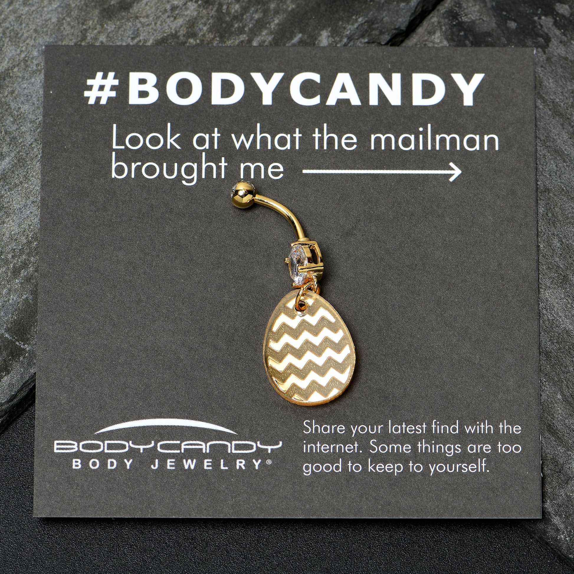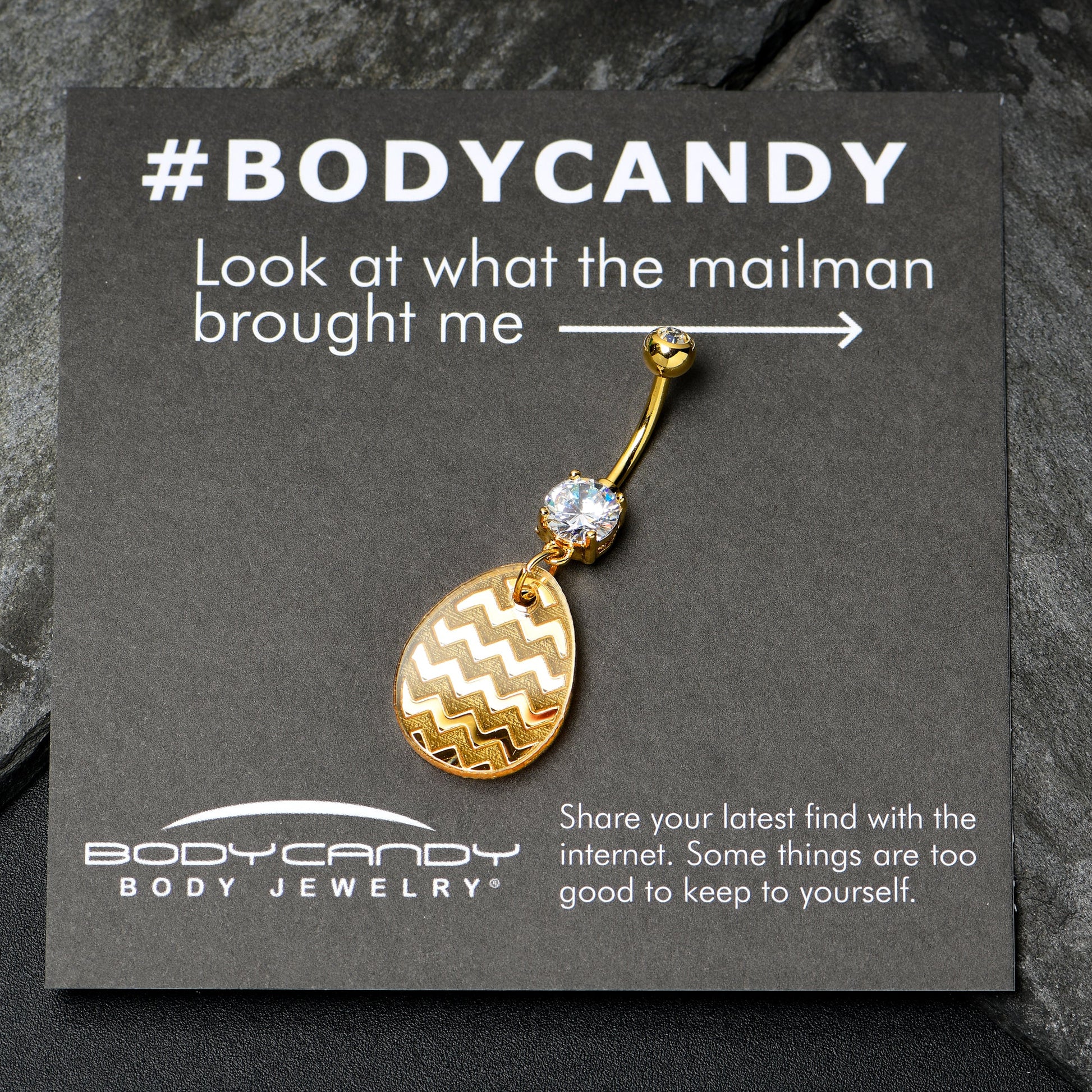 Chocolate is nice but a bit of bling for Easter, like this 14 gauge navel ring, is definitely better. It is made with a 7/16 inch gold tone electroplate over 316L surgical grade stainless steel curved barbell. The top ball end is 5mm and set with a clear gem, while the bottom end features a single large clear gem. Dangling beneath is a matching golden tone Easter egg charm, embellished with a chevron pattern for a luxe and and eye-catching look. Get glam for Easter with this stylish and sumptuous belly piercing ring.Specifications