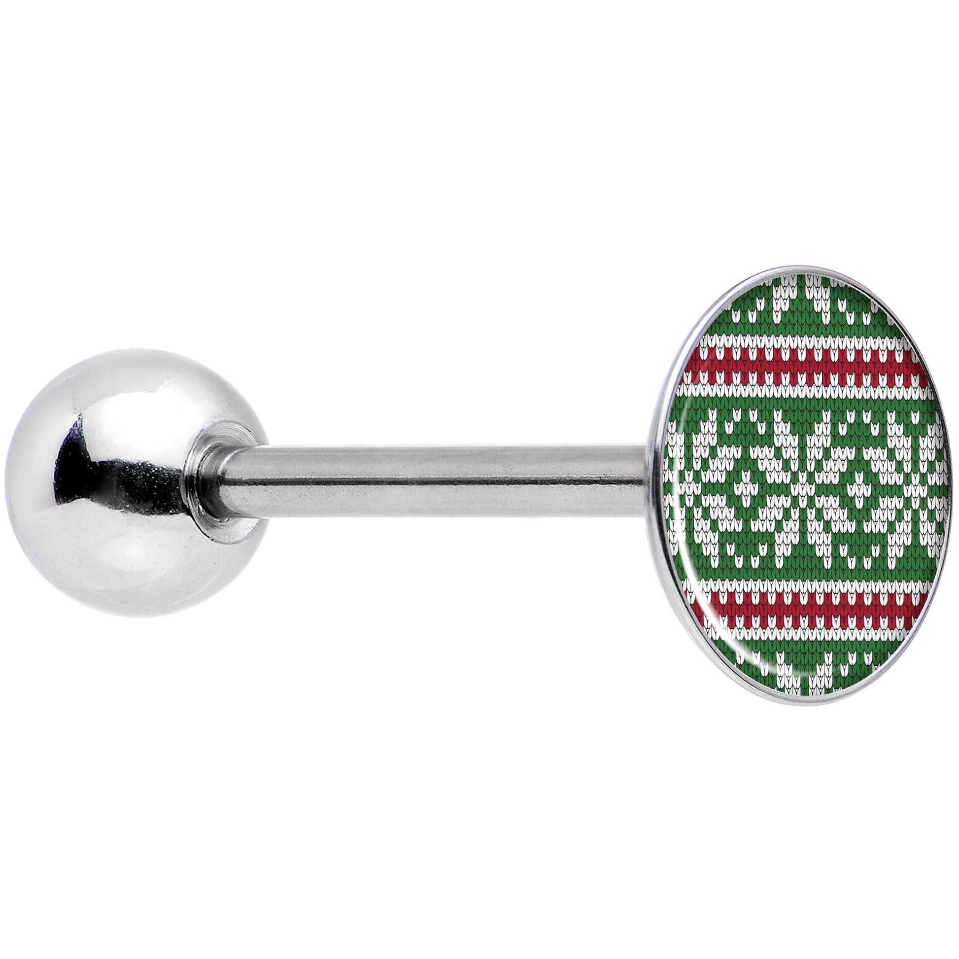 Get decked out from head to toe in Christmas spirit when you wear this festive 14 gauge holiday tongue jewelry! Made with a 5/8" durable 316L surgical grade stainless steel straight barbell, this holiday barbell tongue piercing features a green with red and white snowflake Christmas sweater logo inlay. This Christmas sweater holiday tongue earring makes a perfect seasonal gift for someone special to you.