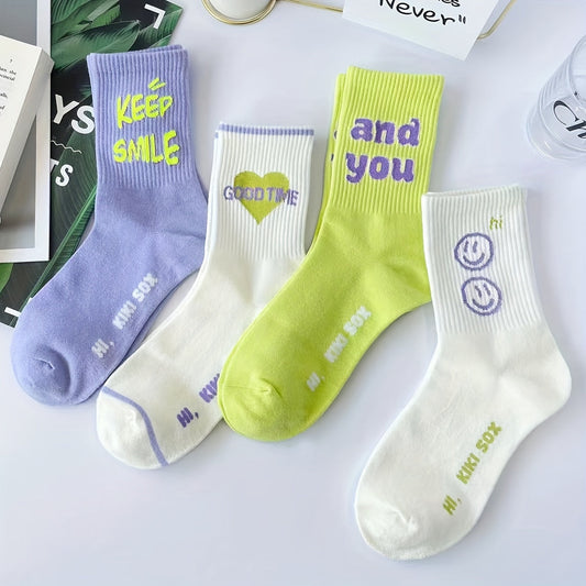 4 Pairs Fashionable Letter Graphic Socks - Womens Athletic Mid-Calf Stockings - Soft, Breathable & Trendy Designs for Everyday Wear