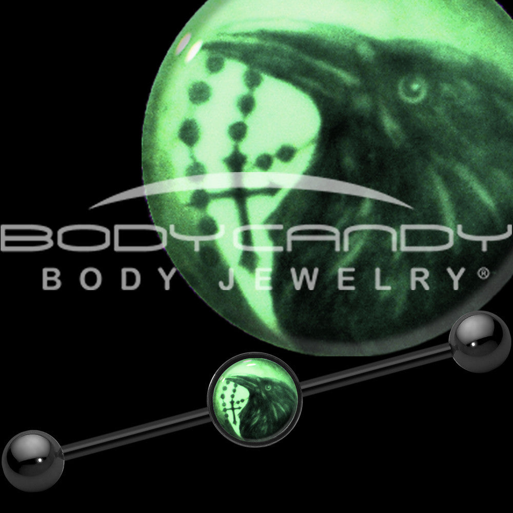Show off your interest in all things Halloween scary when you wear this helix barbell. Made with a 1.45" black anodized titanium over surgical grade stainless steel straight barbell, this helix jewelry features a nonmoving, glow in the dark black raven and cross on a black background logo inlay. If you're ready for something spooky you will love this industrial barbell.