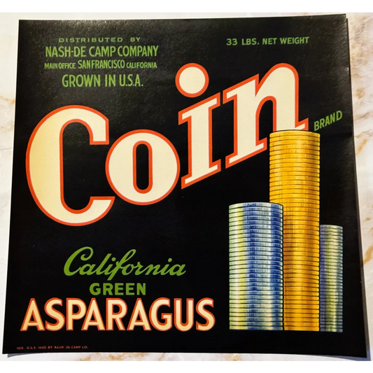 Vintage Nash-De Camp Coin Asparagus Crate Label Treasure