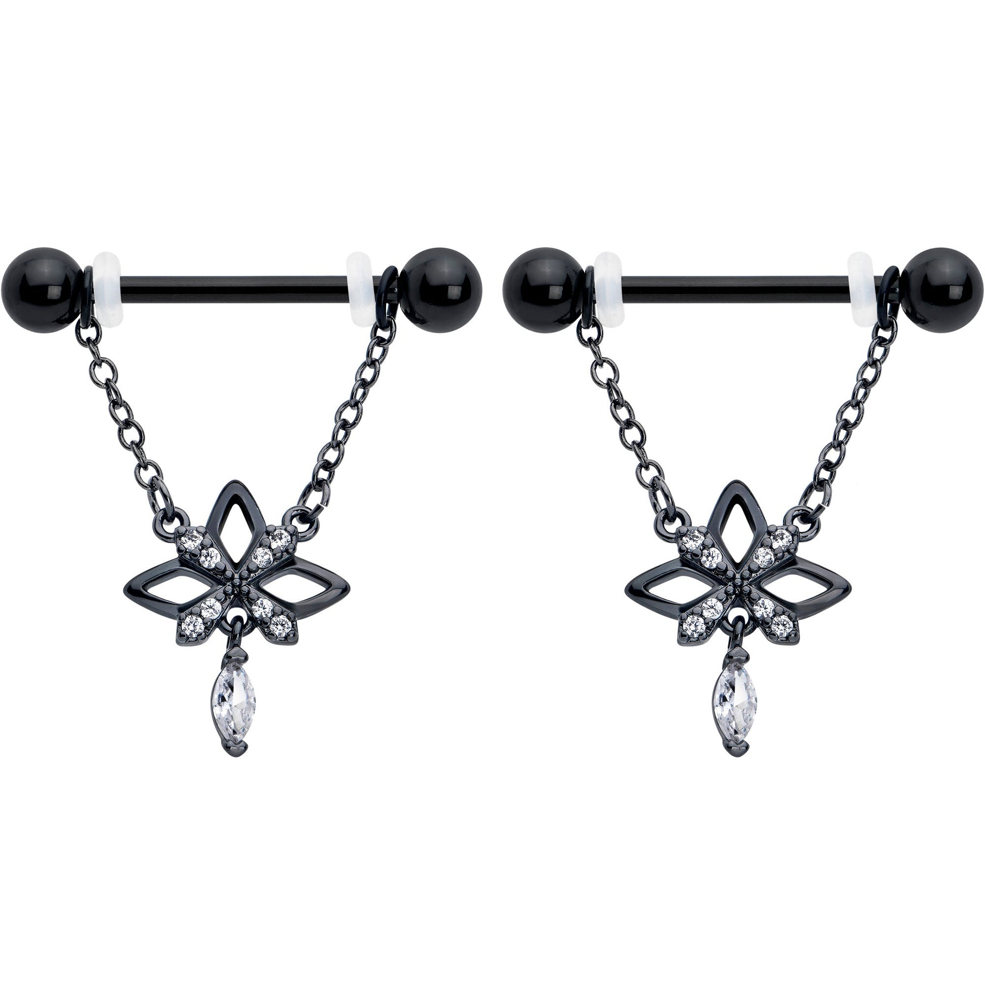 Fall in love with a goth new look, like on this 14 gauge nipple jewelry. It's made with 14mm black PVD over 316L surgical grade stainless steel straight barbells with 5mm ball ends. Each barbell features a double length of matching chain. Dangling from each set of chains is a star charm with an X over it, set with clear cubic zirconia gems along the legs. They are further embellished with matching clear cubic zirconia gem dangles for added style. Let your inner goth come out to play with these darkly divine nipple piercing rings. Sold as a set of two.