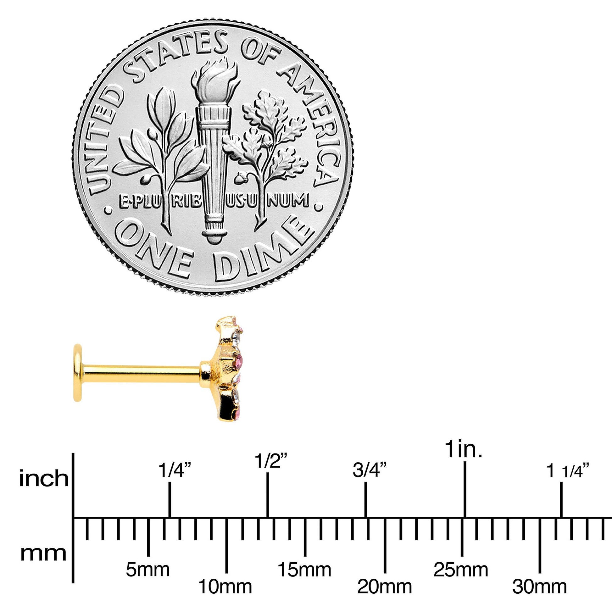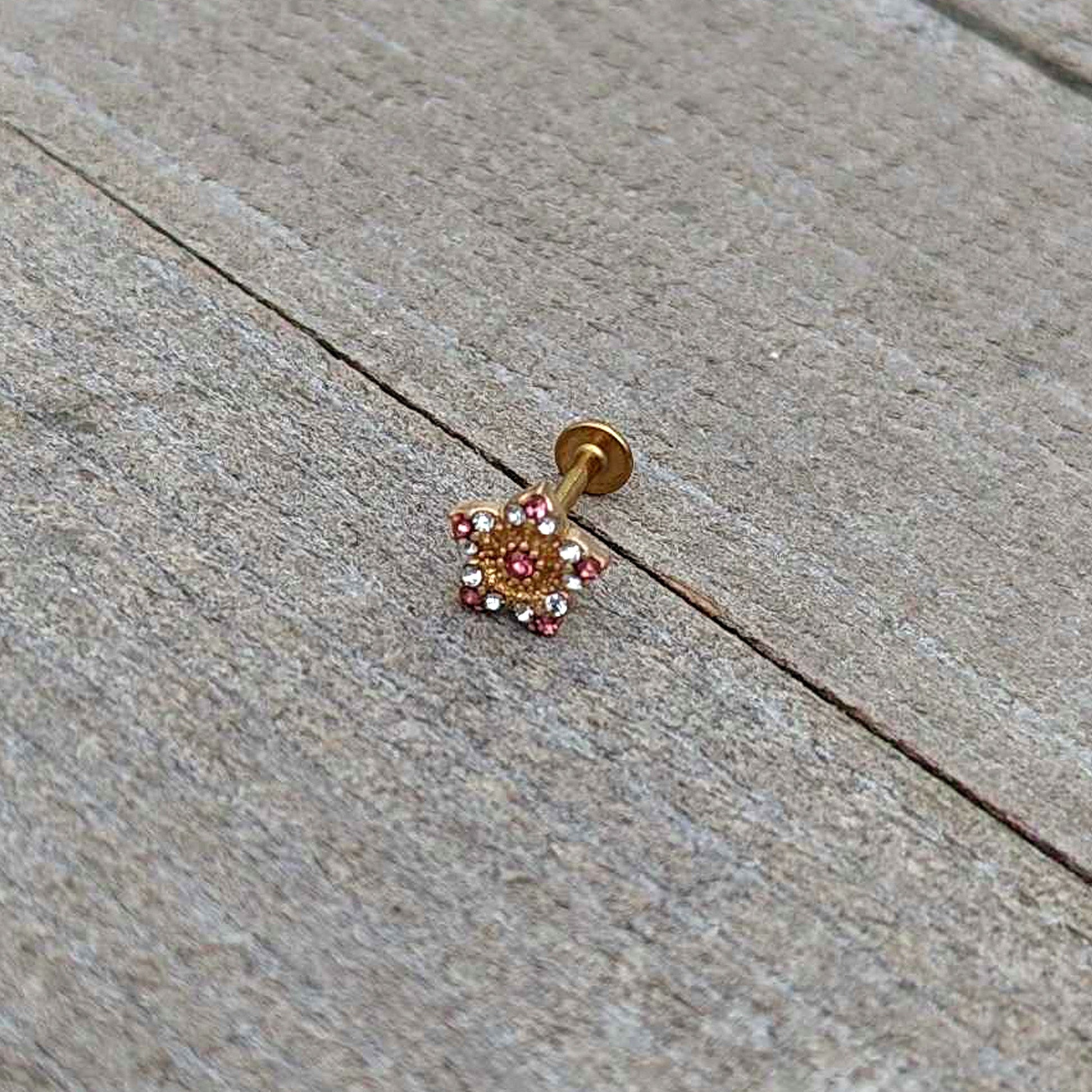 Be a star in the universe like the star on this 16 gauge lip ring! It's made with an 8mm gold tone PVD over 316L surgical grade stainless steel straight post with a flat disc end. It features a five-pointed star charm. The star features clear and pink gems set within, as well as textured detailing. You can even sport this star in multiple piercings including lip, monroe, tragus, helix, and some conch piercings. Let your cartilage piercings be stars with this splendid star cartilage jewelry!