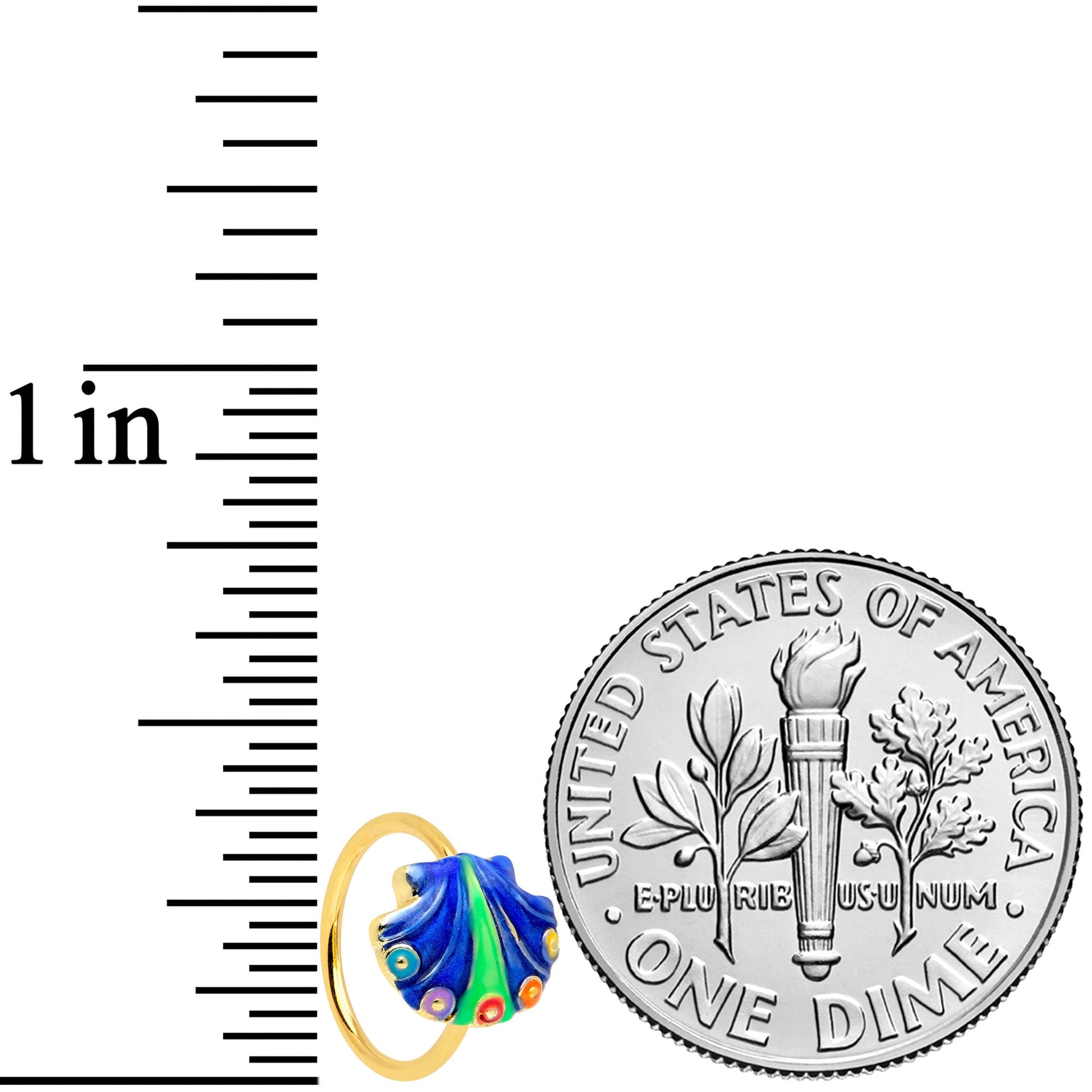 You don't need a towel to go down the shore with this 20 gauge nostril ring! It's made with an 8mm gold tone PVD over 316L surgical grade stainless steel circular ring. It features a shell-shaped charm, in deep rich blue. The shell is embellished with a green stripe and tiny dots in a rainbow of colors. If you've ever wanted to wear shells like a mermaid, this is your perfect opportunity with this sexy scallop shell nose piercing jewelry!