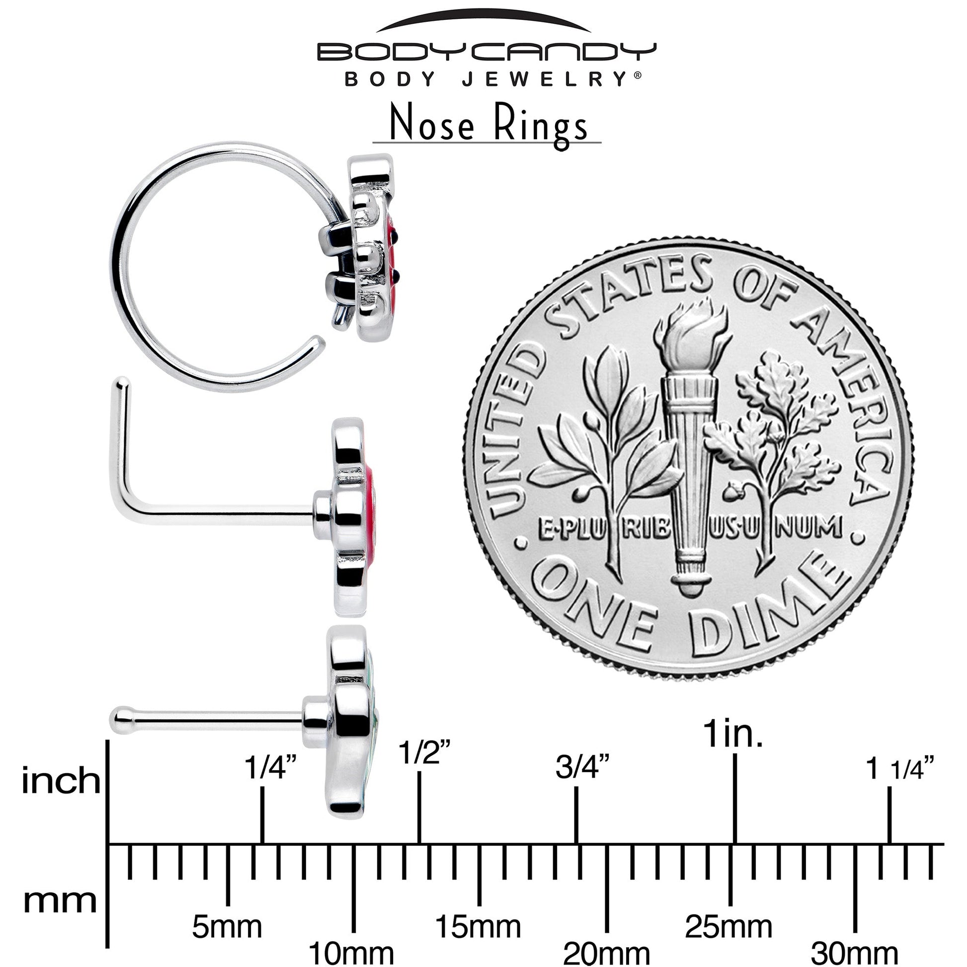Get a look for every occasion with this set of 20 gauge nostril rings. One is made with a 0.27 inch length at the bend 316L surgical grade stainless steel L-shaped post and features a simple flower charm, with red petals and a happy smiling face on its yellow center. The second one is made with an 8mm 316L surgical grade stainless steel circular ring and features a whimsical ladybug charm, embellished with red inlay and black spots for a more realistic appearance. The third is made with a 6mm durable 316L surgical grade stainless steel straight post and features a simple green leaf charm with textured detailing. You will be ready for anything with this nose piercing jewelry. Sold as a set of three.