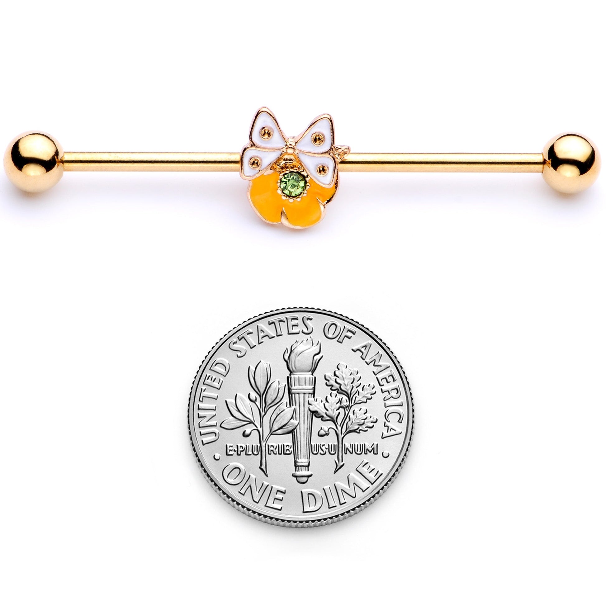 14 Gauge Green Gem Gold Tone Butterfly Flower Industrial Barbell 38mm
