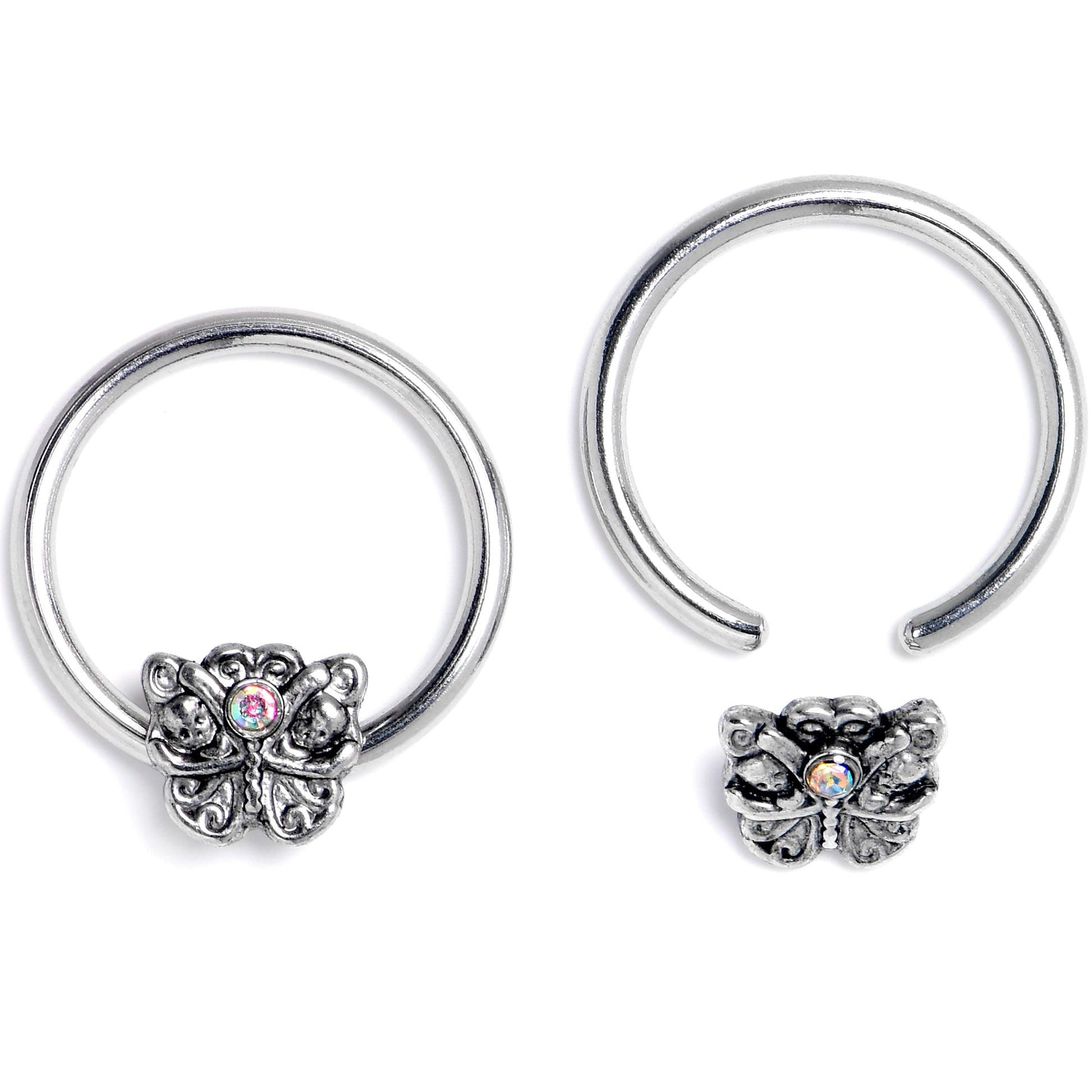 Whether you have a lot of piercings or like a cohesive look, this set of 16 gauge septum rings has you covered. They are made with 10mm black anodized over 316L surgical grade stainless steel circular rings. Two have simple matching captive beads for a classic appearance. The other two feature captive butterfly charms, set with aurora gems and embellished with contrasting detail. They feature a captive design for secure wear and you can even rock these in multiple piercings including helix, daith, and some conch piercings. You will be ready for anything with this baroque and beautiful butterfly cartilage piercing jewelry. Sold as a set of four.