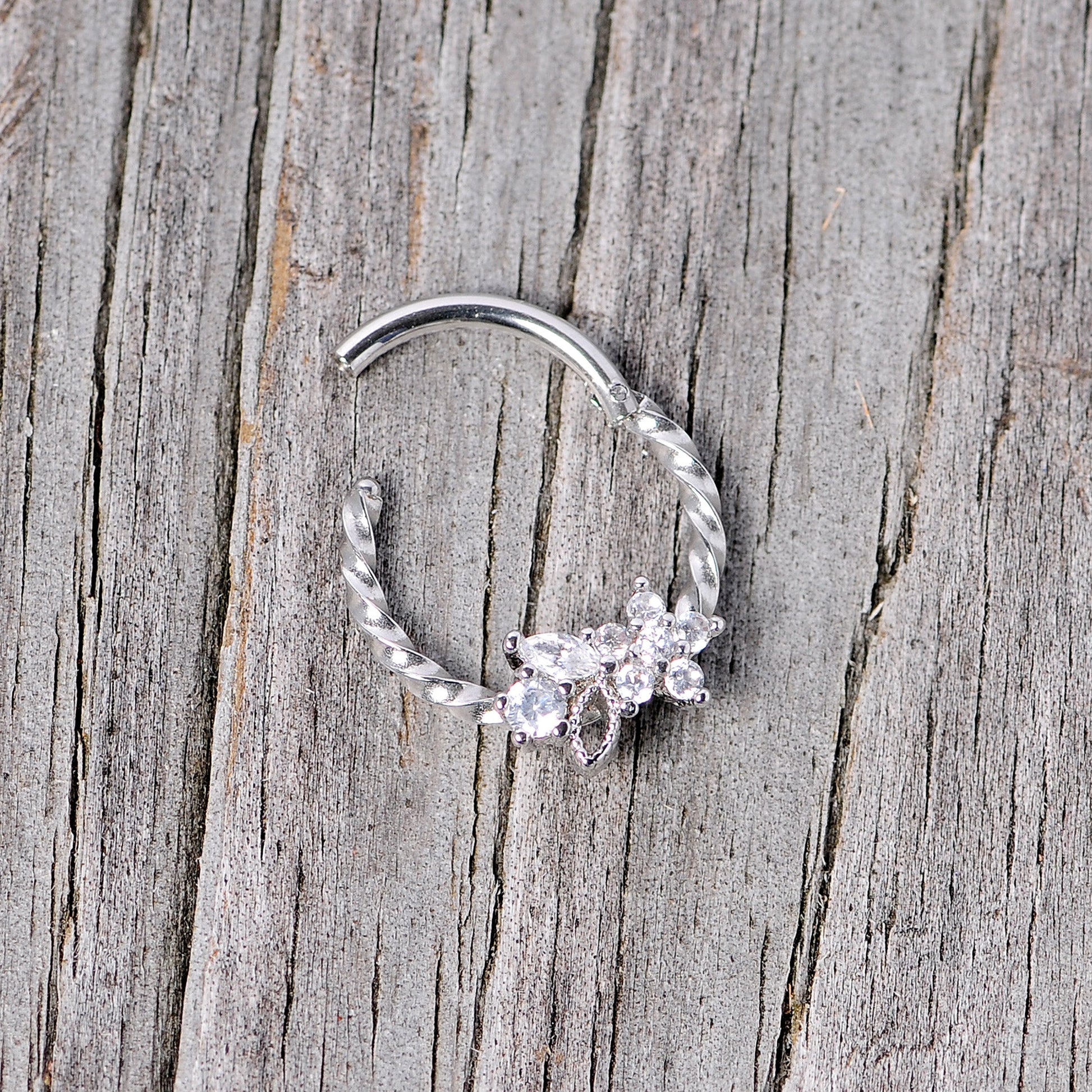 Put a new twist on your cartilage piercings with this 16 gauge segment ring! It's made with a 10mm durable 316L surgical grade stainless steel hinged twisted circular ring. It features twisted sides and is crowned on the bottom with a cluster of clear gems. They form a small star, as well as adding geometric embellishments. This cartilage earring features a hinged, non-removable segment that makes it super easy to insert and remove. You'll love that because it works so well in multiple piercings including septum piercings as well as cartilage piercings like the tragus, helix, daith, and more! That's a twist you won't regret!Specifications