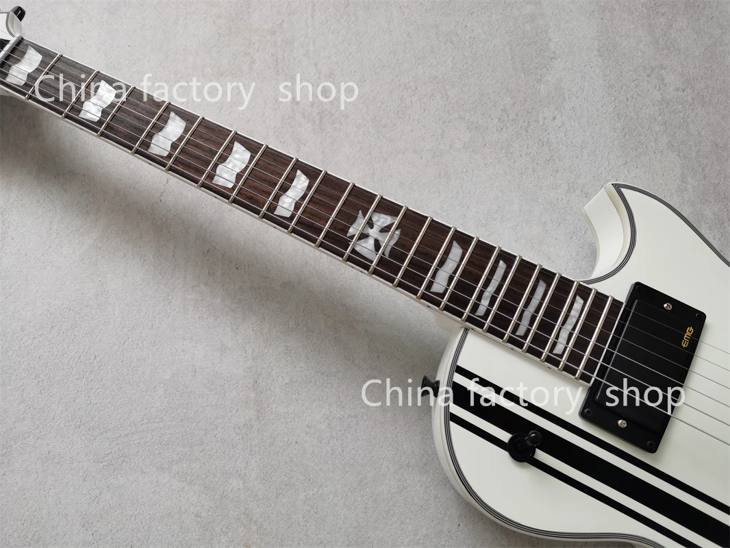 Engineered for players who want riffs that kick doors off hinges, bends that glide like buttered lightning, and tone so ruthless it should come with a witness-protection pamphlet. Inspired by the legendary iron-cross vibe—no affiliation with ESP or James Hetfield—this axe brings the attitude without the celebrity tax.