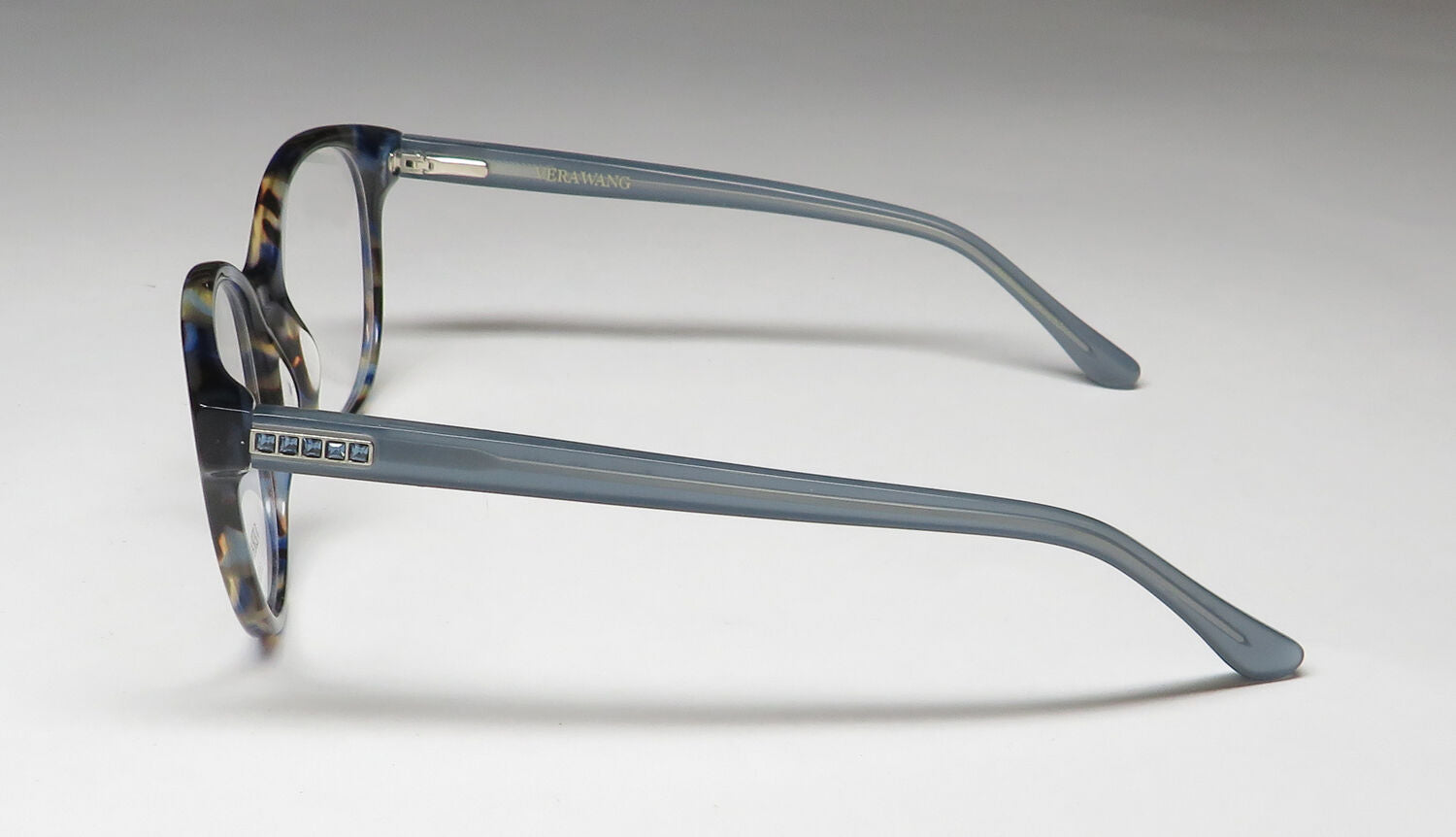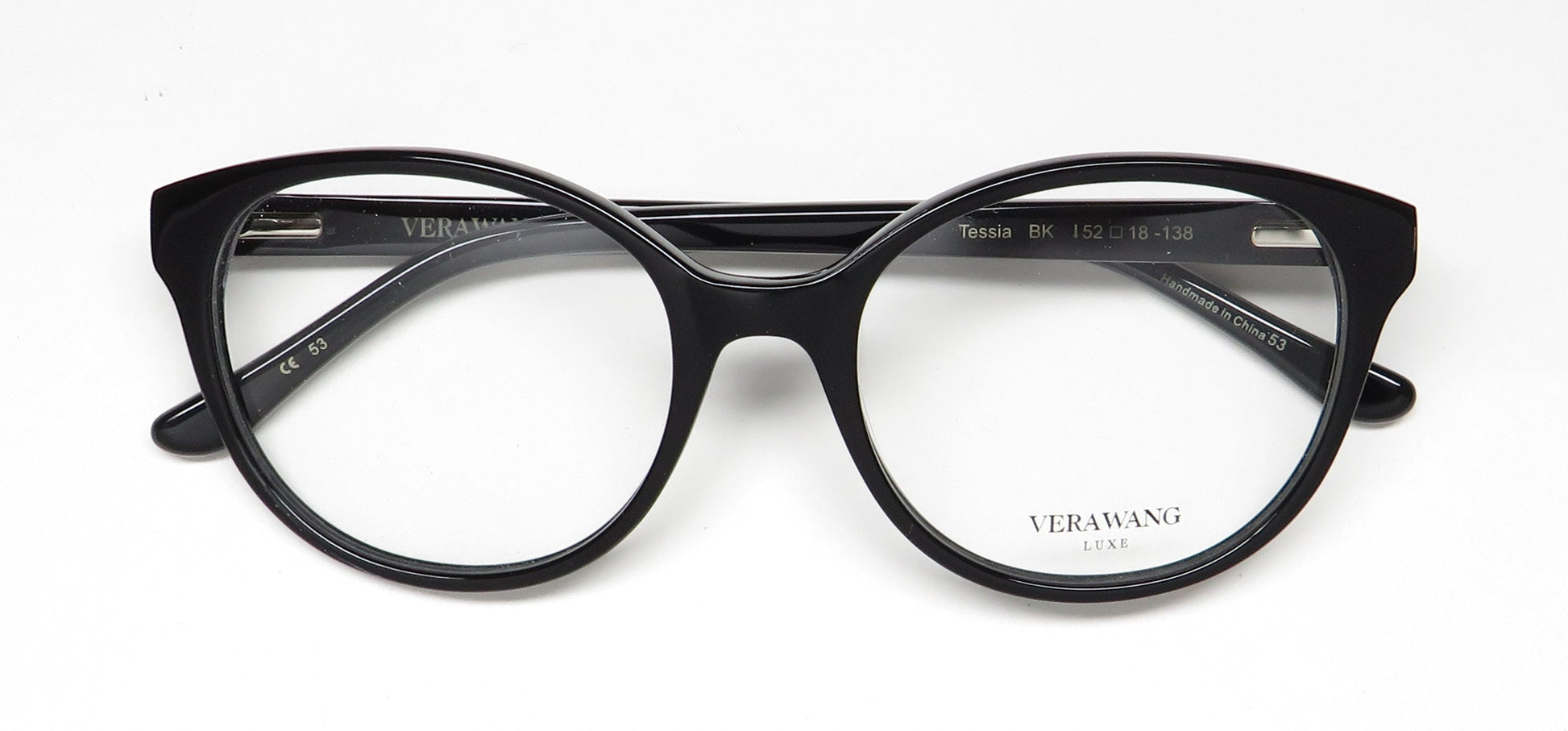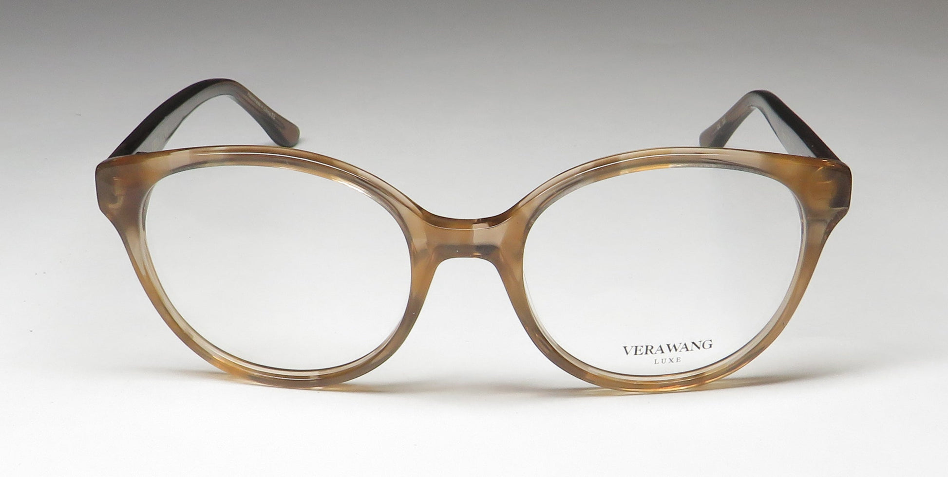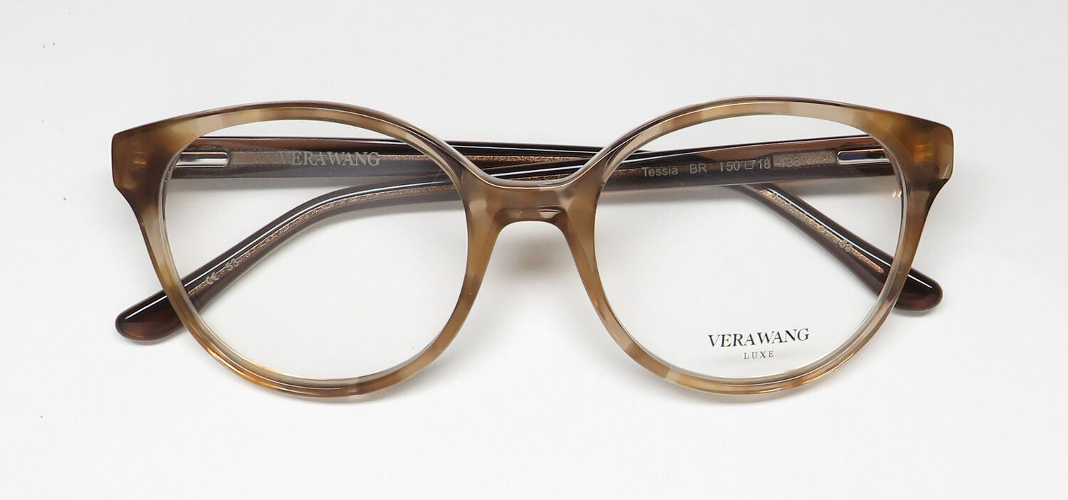The frame is sold with demo lenses that have a logo stamped on them in ink. The frame can be fitted with real lenses at most optical stores. This frame provides comfortable fit and flatters a variety of face shapes. These eyeglasses are crafted from high quality, durable premium acetate plastic. The frame has spring hinges. Spring hinge temples prevent you from stretching the fit of your glasses and ensure that they remain intact and not become loose or out of shape. This frame is from exclusive Luxe collection. This is a flagship line of eyewear manufactured by Vera Wang from highest quality materials. Original case is included. The glasses are made in China.