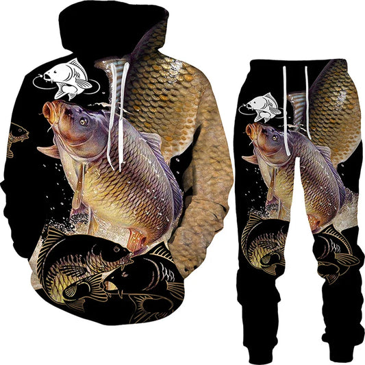 New 3D Fishing Art Print Casual Couple Hoodies Outfits Hip Hop Streetwear Hooded Sweatshirt+Sweat Pants Men's Tracksuit Set