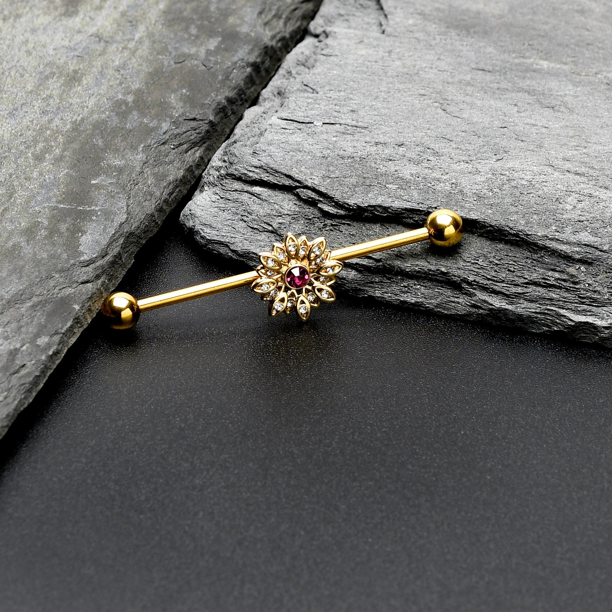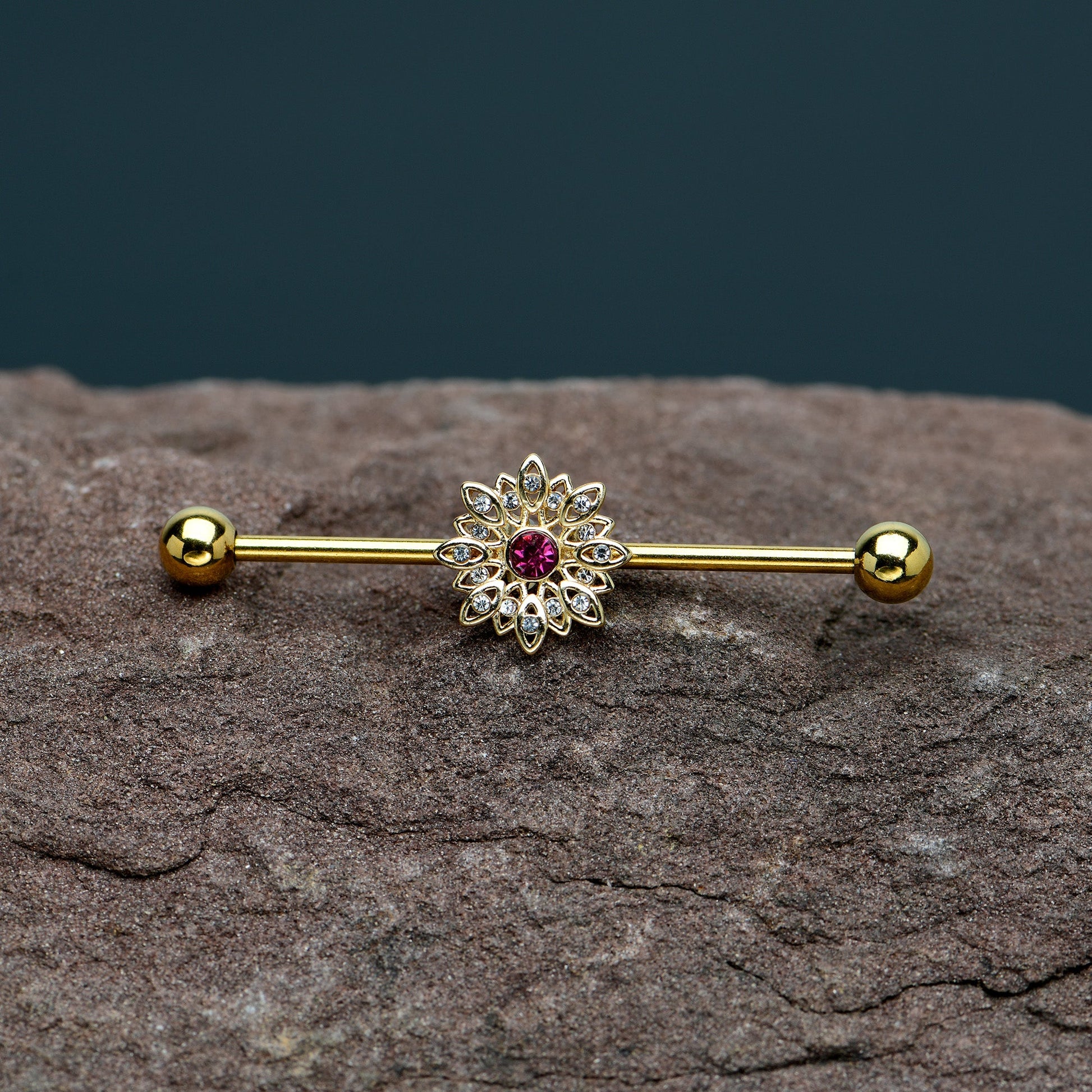 14 Gauge Clear Pink Gem Gold Tone Starry Flower Industrial Barbell 38mm