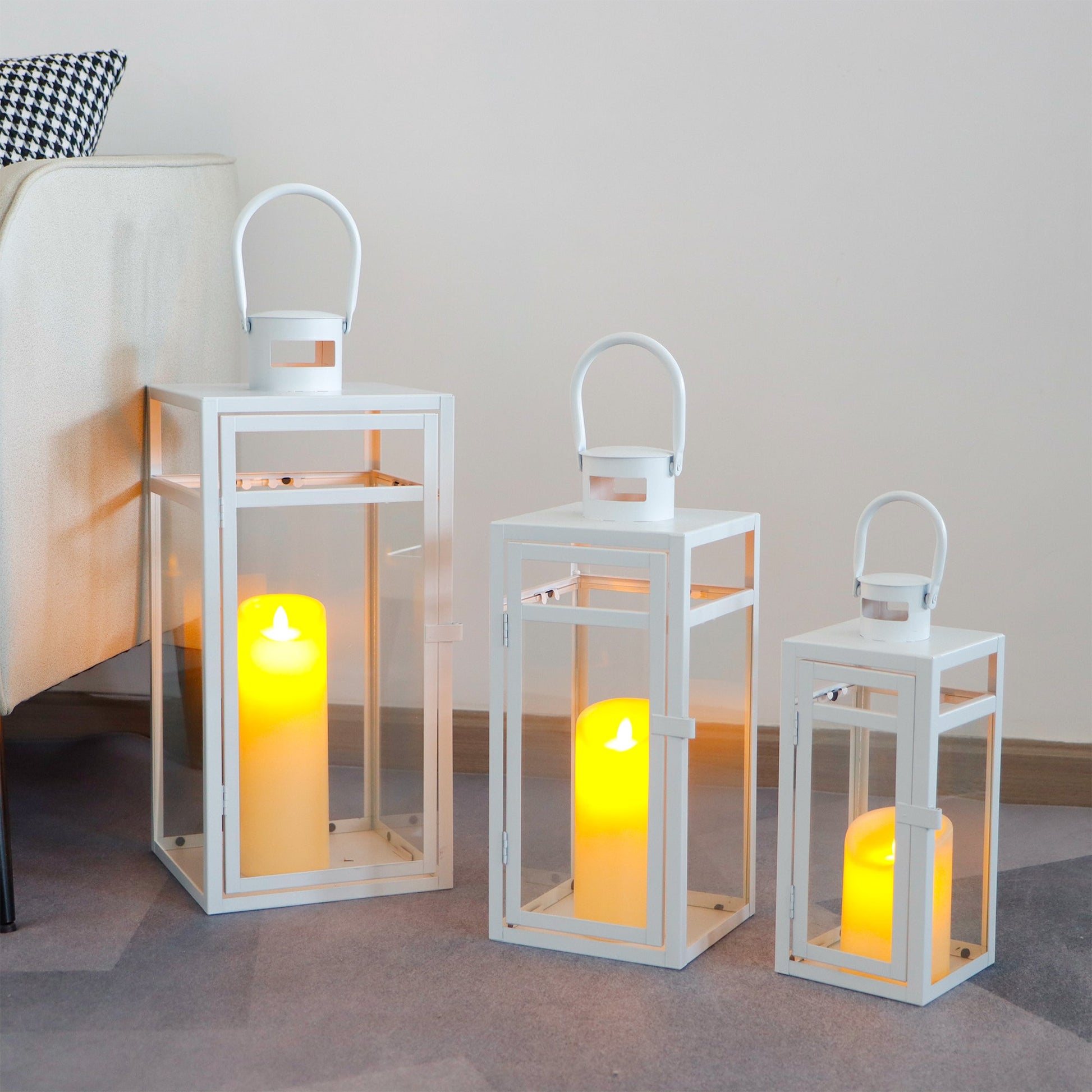 Metal Candle Lantern Set (3pcs, 12/15/19"): Tall Hanging, Tempered Panels, White (Indoor/Outdoor)