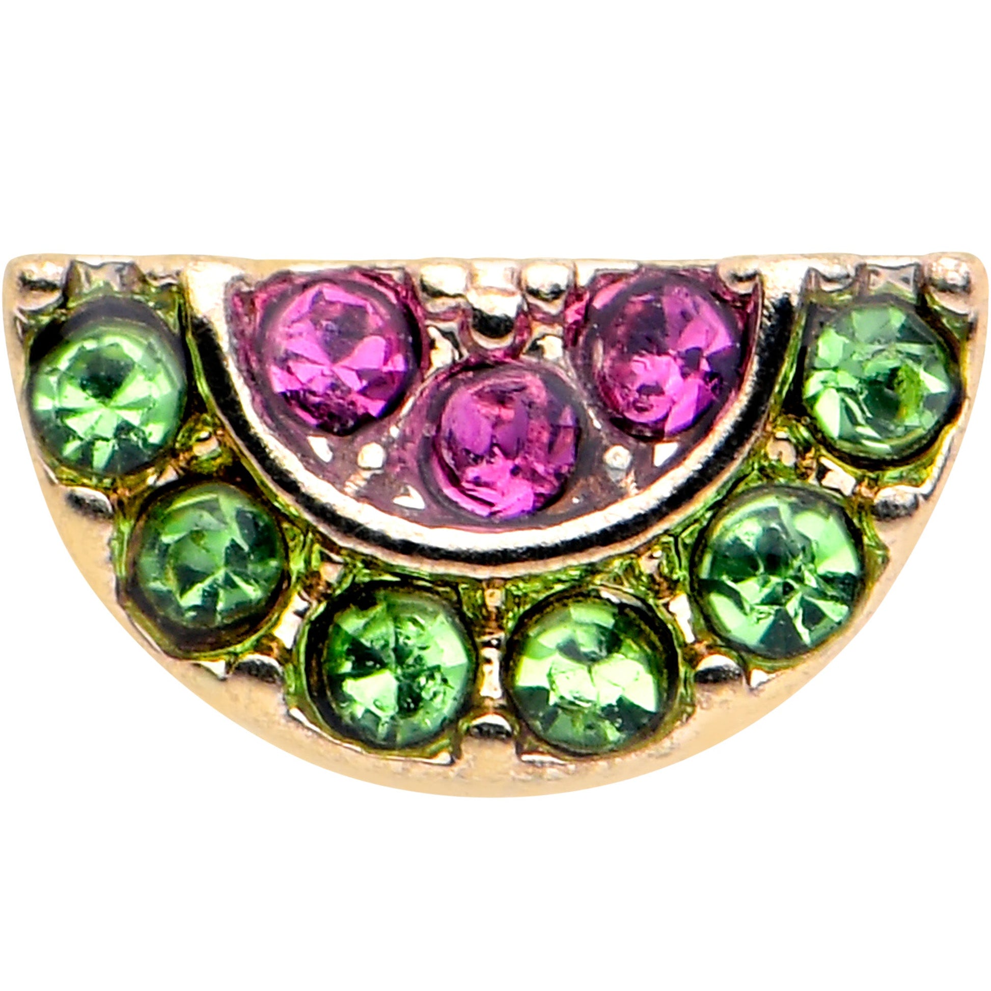 Your nose piercing will look downright delicious when you are wearing this 20 gauge nostril jewelry. It is made with a .27 inch length at the bend gold tone PVD over 316L surgical grade stainless steel L-shaped post. It features a wedge of watermelon charm, paved in green and pink gems. Get a tasty summer look with this wonderful watermelon nose piercing ring.