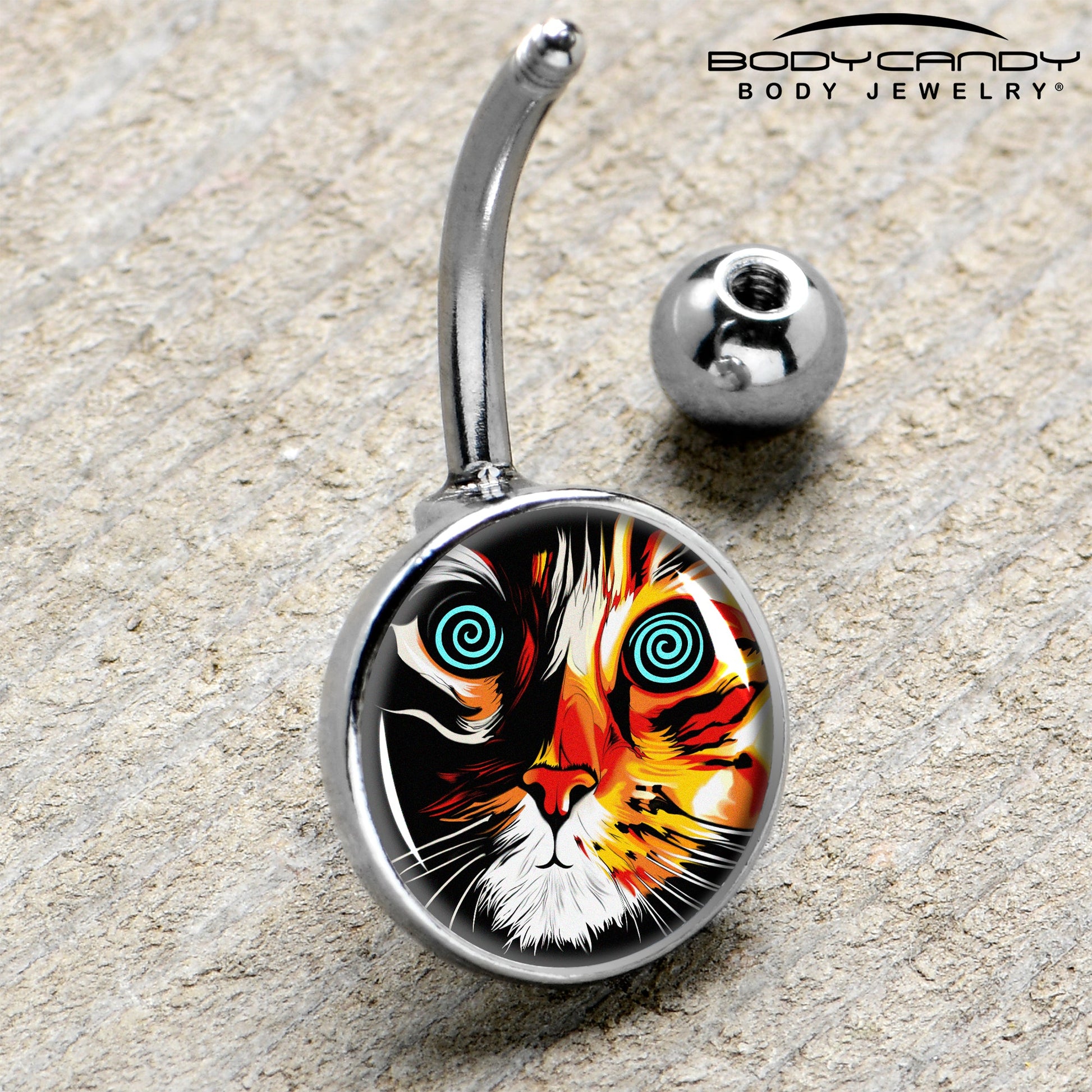 Step into the spiral along with the trippy kitty on this 14 gauge navel ring. It's made with a 7/16 inch 316L surgical grade stainless steel curved barbell with a 5mm top ball end. The bottom end features a cat charm. The cat is orange with white detailing and features trippy looking spirals in its eyes for a truly psychedelic effect. Get style that is almost dizzying with this totally tripped out kitty cat belly piercing jewelry.