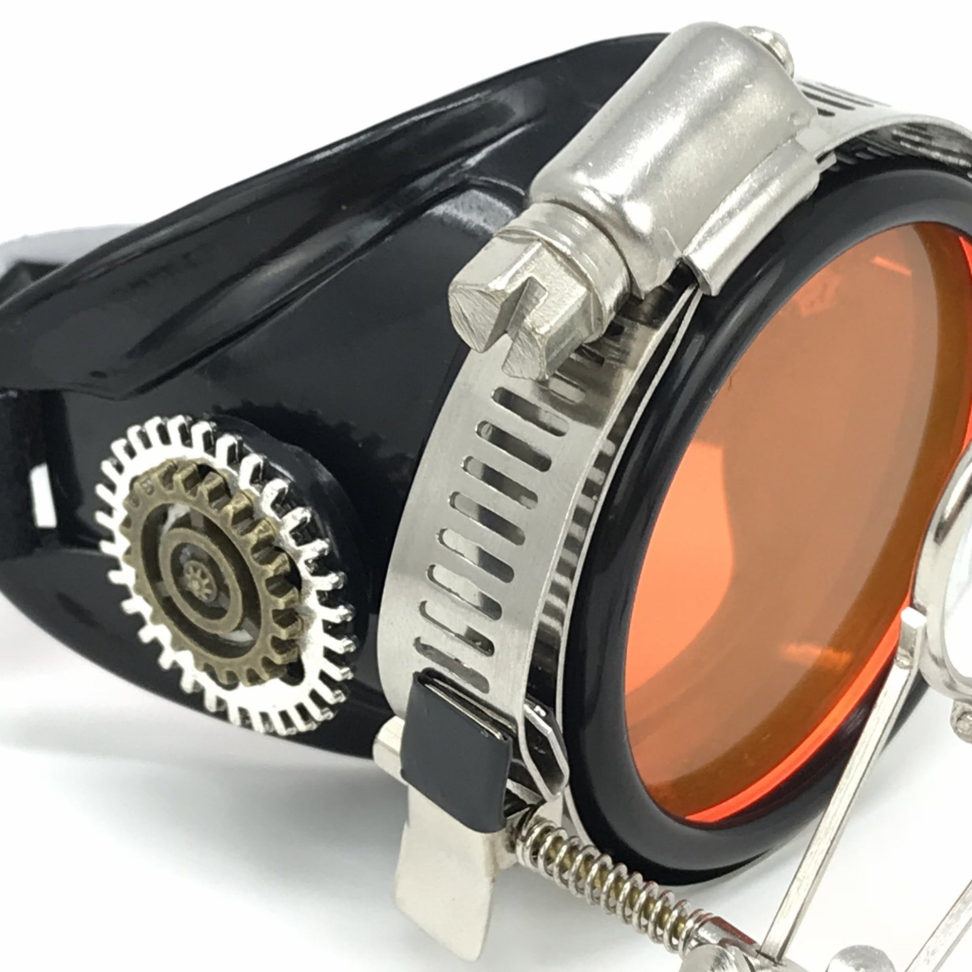 Sleek black plastic frame, antique style gear embellishments on the side vent
