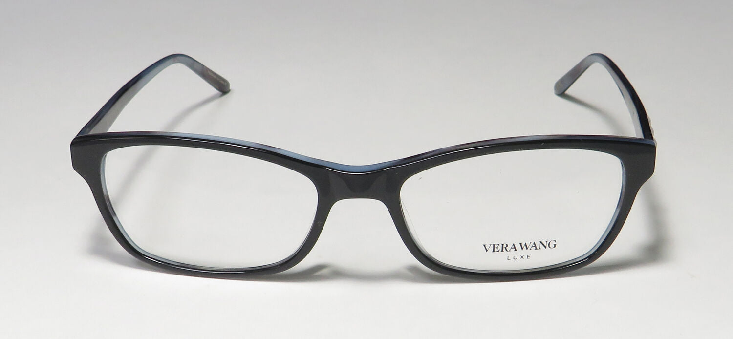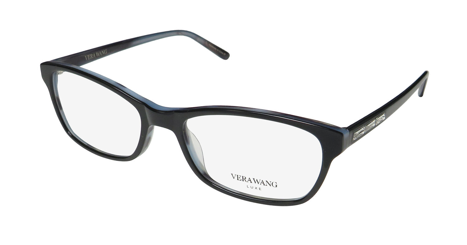 The frame is sold with demo lenses that have a logo stamped on them in ink. The frame can be fitted with real lenses at most optical stores. This frame provides comfortable fit and flatters a variety of face shapes. These eyeglasses are crafted from high quality, durable premium acetate plastic. This frame is from the exclusive Luxe collection. This is a flagship line of eyewear manufactured by Vera Wang from highest quality materials. Original case is included. The glasses are made in China.