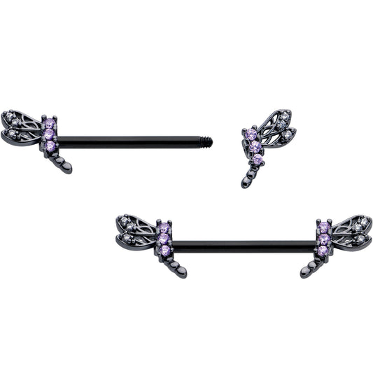 14G 9/16 Purple CZ Gem Black Night Dragonfly Barbell Nipple Ring Set