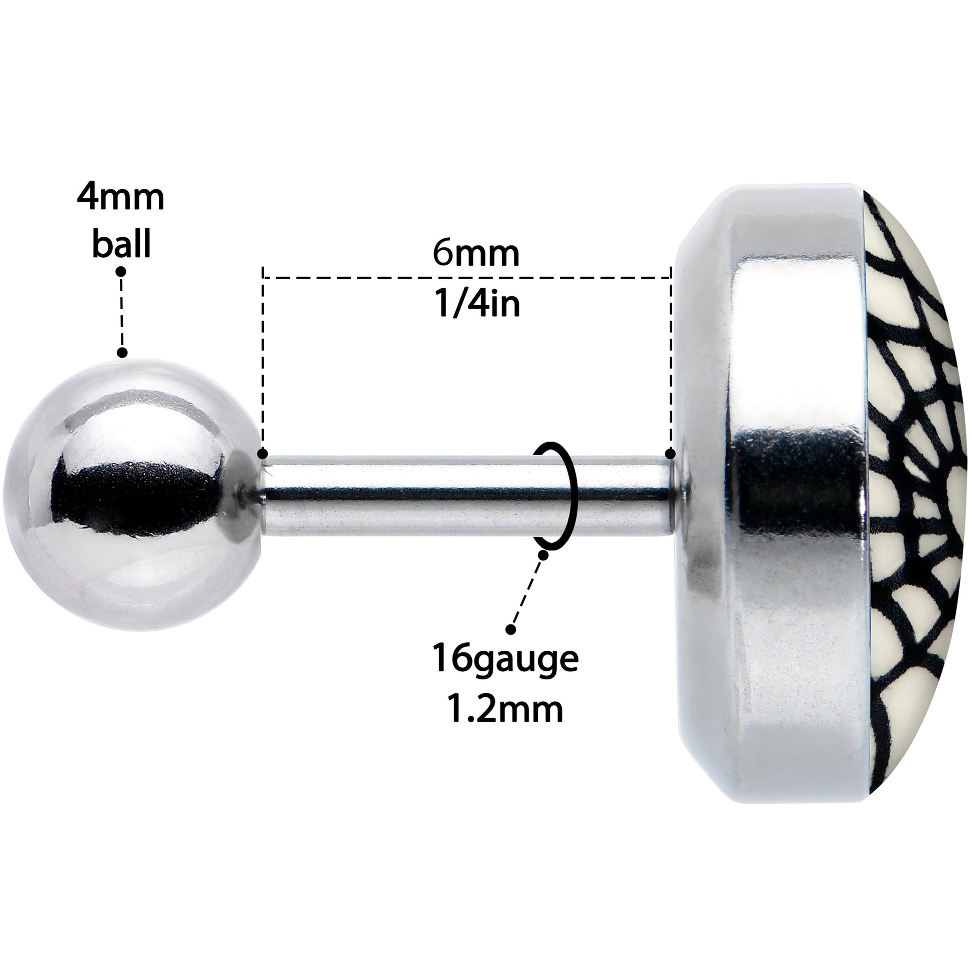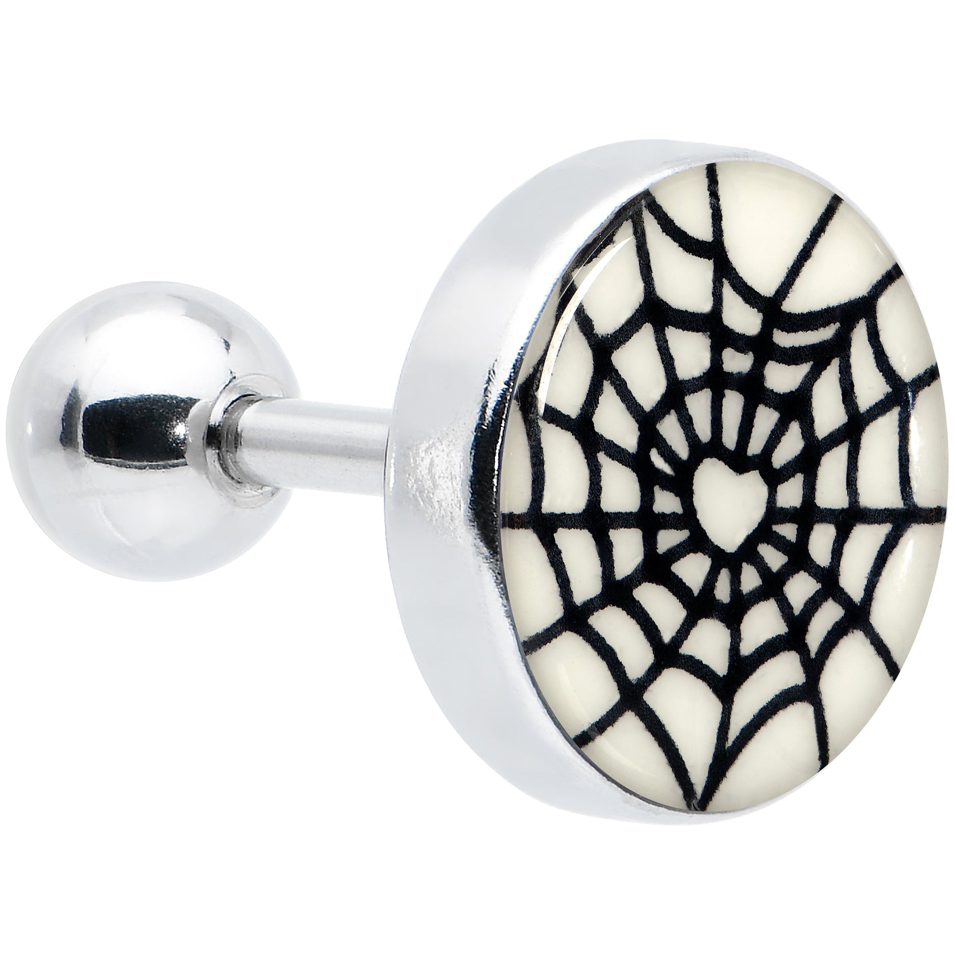 Weave a web of gothic style with this 16 gauge tragus stud. It is made with a 6mm durable 316L stainless steel straight barbell with a 4mm ball end. It features a white charm of a black spider web with a heart woven into the center. Best of all, when you turn down the lights it glows in the dark and you can rock it in multiple piercings including tragus, helix, and some conch piercings. Fall in love with this creepy crawly arachnid themed cartilage piercing ring.Specifications