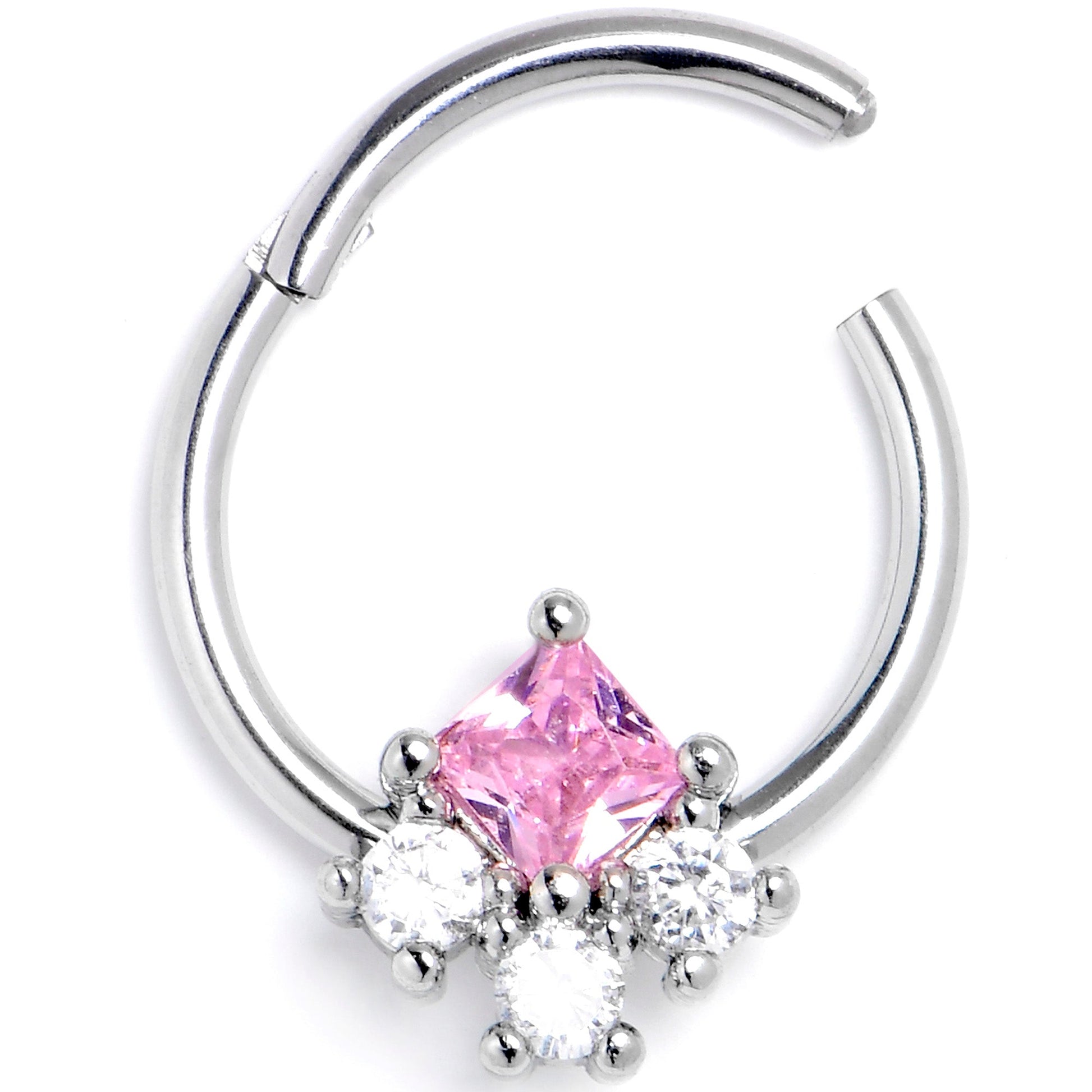 Your look is sure to be a hit when you are rocking this 16 gauge septum ring. It is made with a 10mm durable 316L surgical grade stainless steel hinged circular ring. It features an elegant rhombus charm, with a pink cubic zirconia gem center and a trio of clear cubic zirconia gem embellishments for a color contrast you can not take your eyes off of. It also features a non-removable, hinged segment that makes insertion and removal a breeze and you can even rock it in multiple piercings including tragus, helix, and some daith piercings. Make an impact with this elegant rhombus cartilage piercing jewelry.