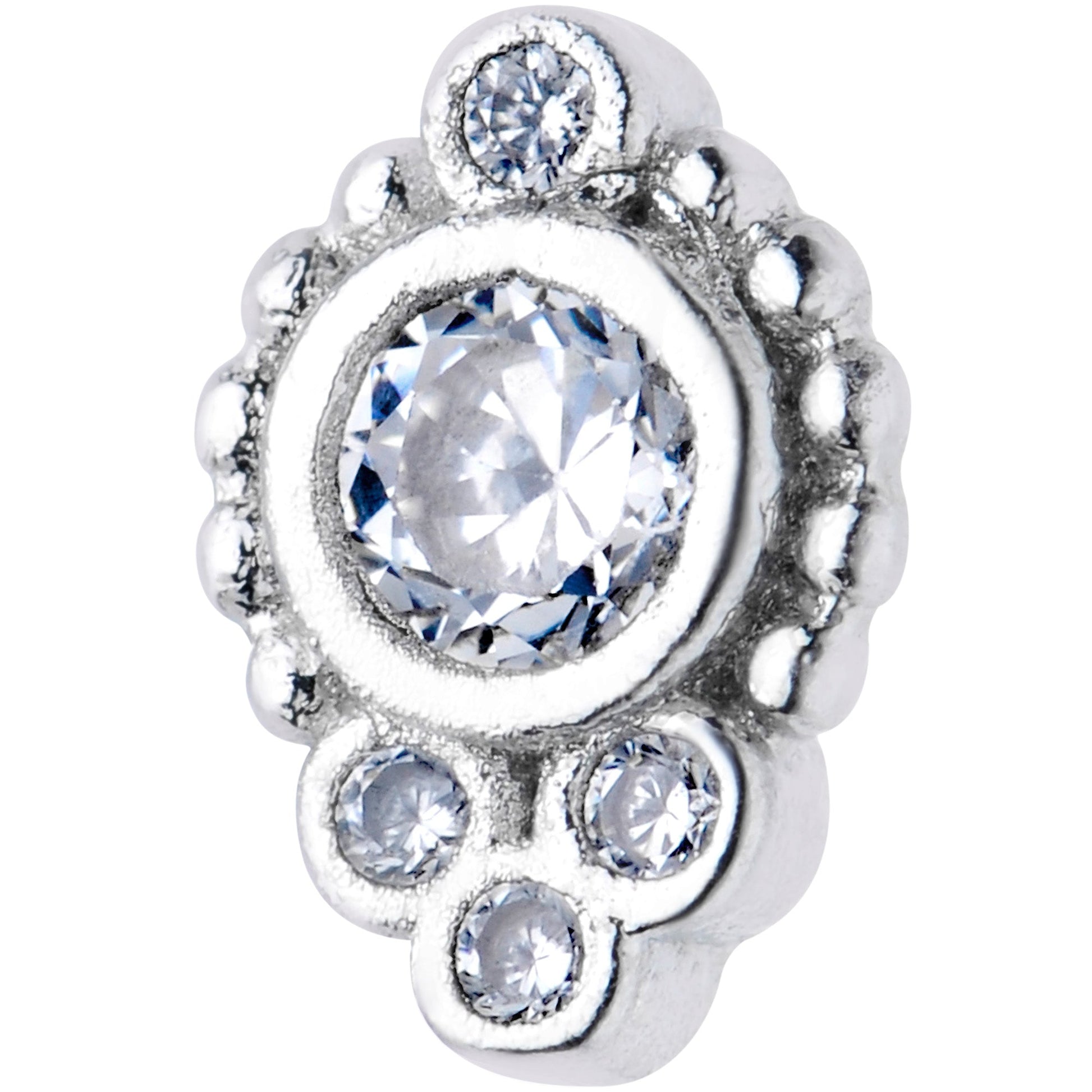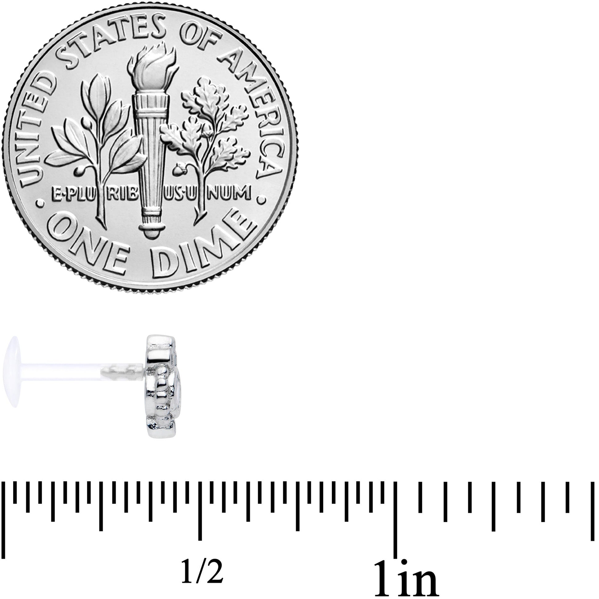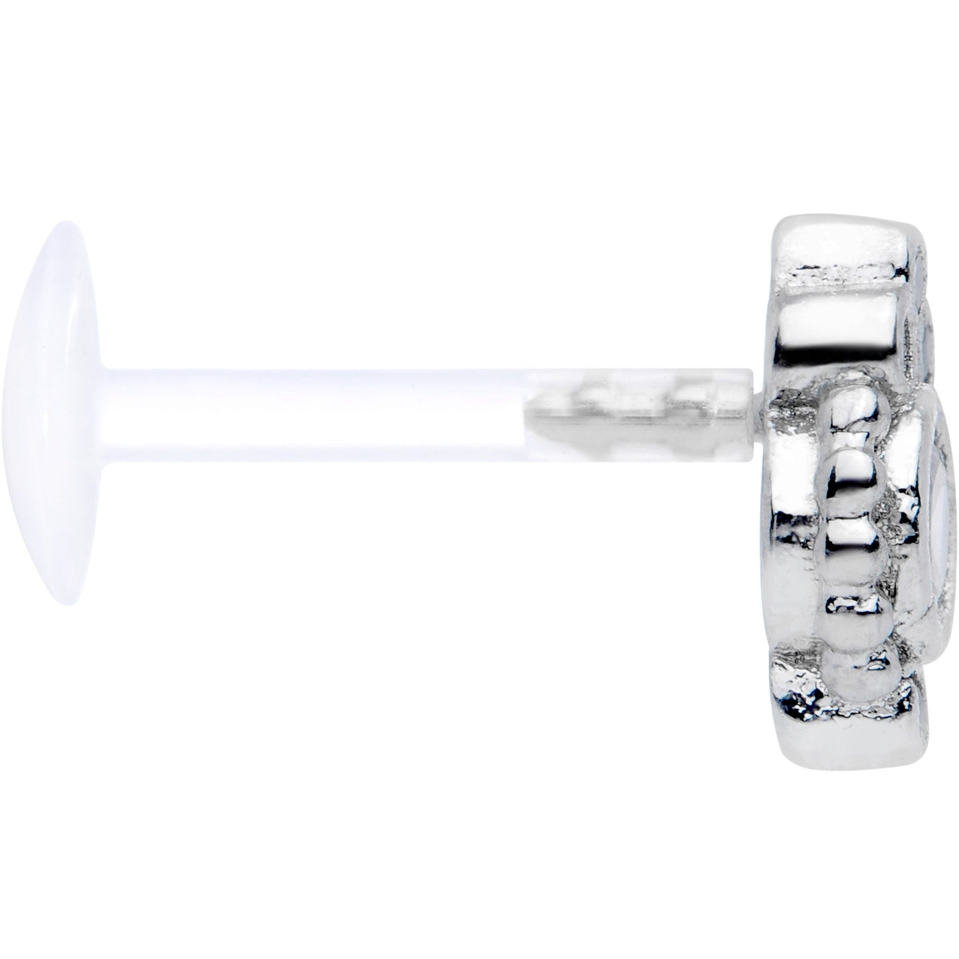 You'll have no reason to shed a tear with this 16 gauge lip ring! It's made with an 8mm flexible Bioplast straight barbell with a flat disc end. It features a round clear gem set in a heavily embellished teardrop-shaped charm. The charm is also textured for an added bit of visual impact. And you can rock this teardrop in multiple piercings including lip, monroe, tragus, helix, and some conch piercings! With its comfortable fit and beautiful form, this lovely labret jewelry is sure to keep you smiling!