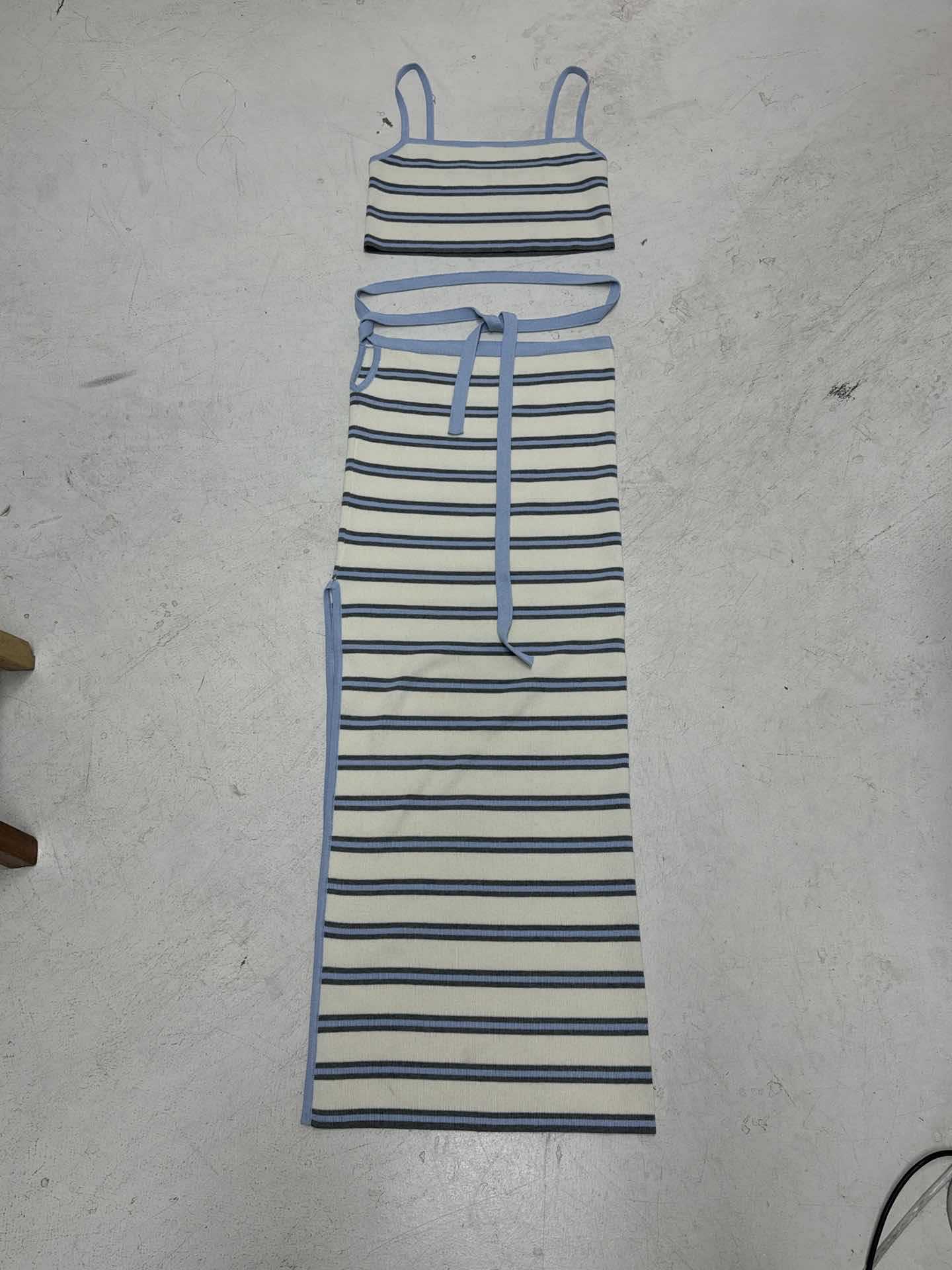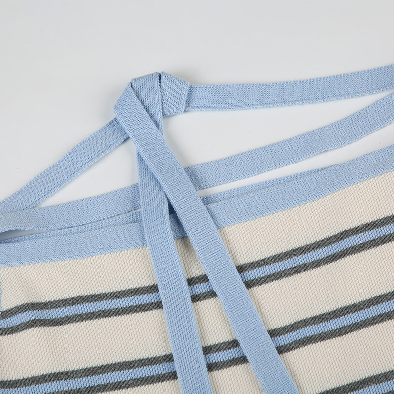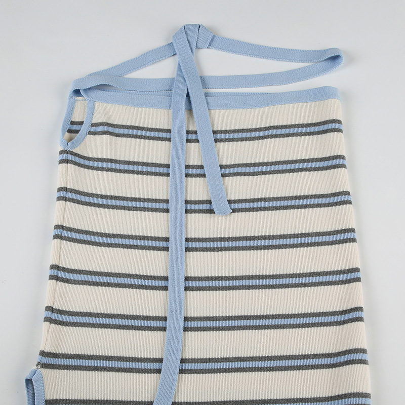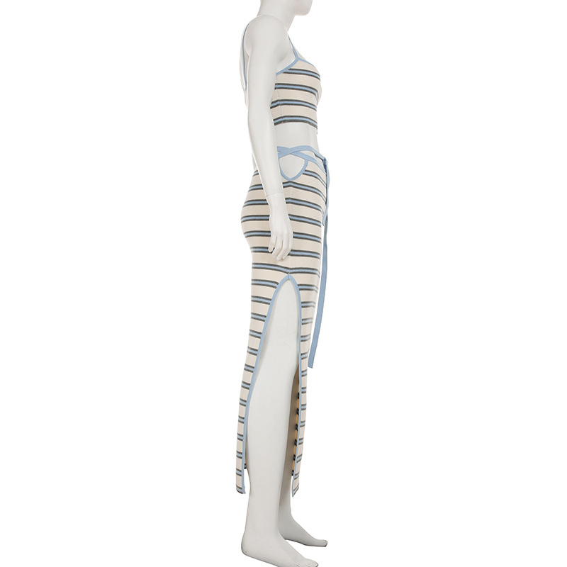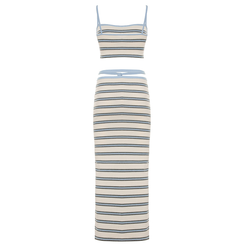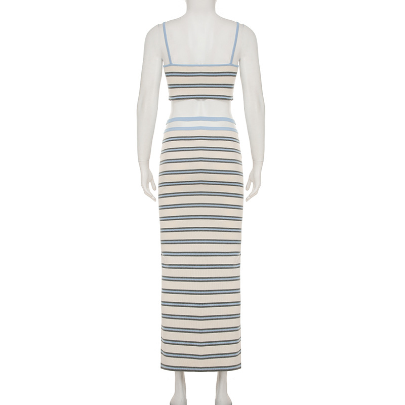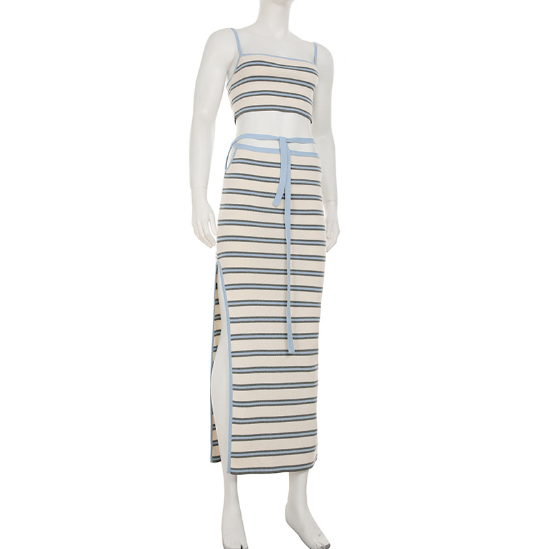Casual Vacation Knitted Striped Skirt Set Cropped Short Strap High Waist Lace up Skirt Two Piece Set