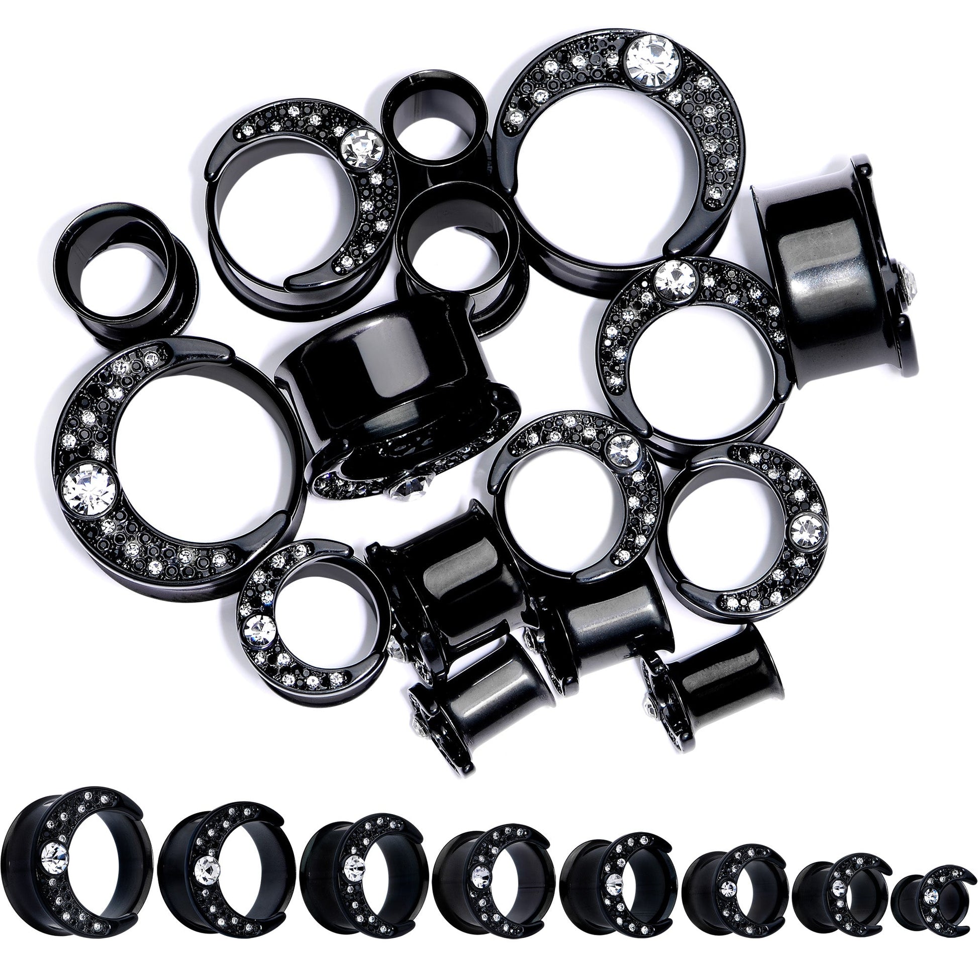 Clear Gem Black Crescent Moon Double Flare Tunnel Plug Set Sizes 8mm to 25mm