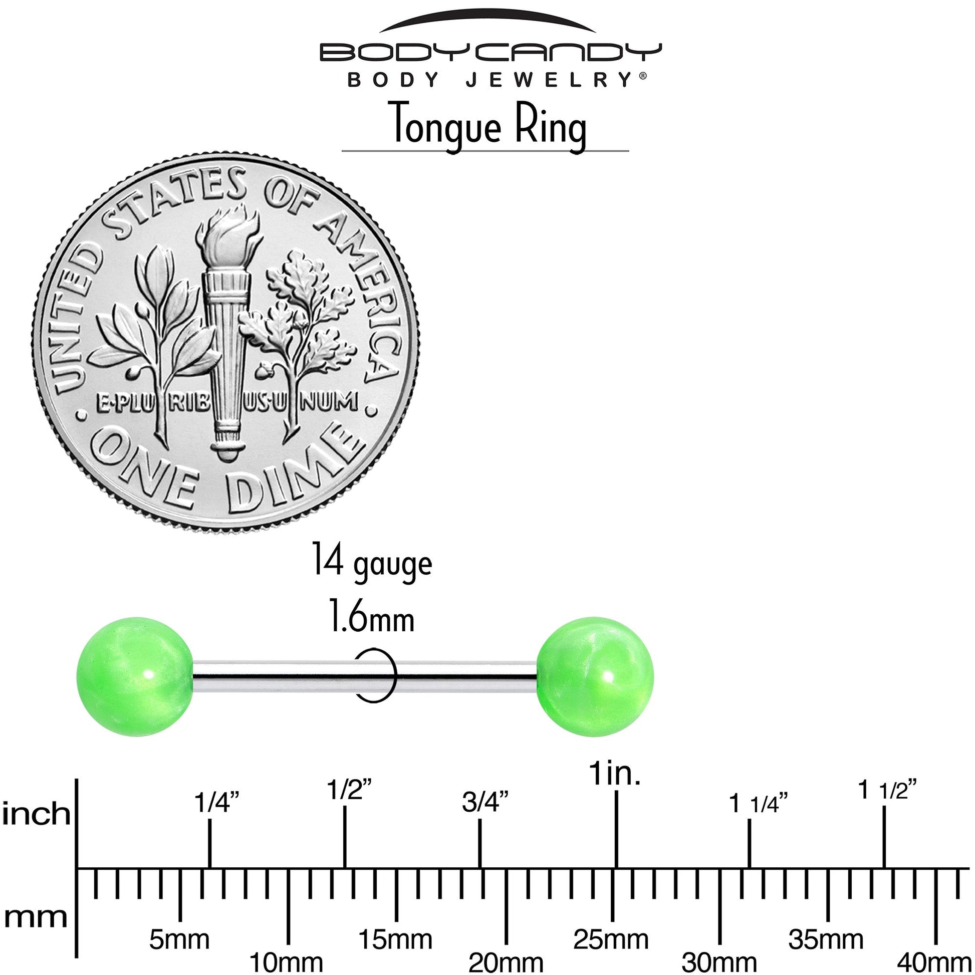 Brighten up your style when you are rocking this 14 gauge tongue jewelry. It is made with a 5/8 inch 316L surgical grade stainless steel straight barbell with 6mm ball ends. It features bright color acrylic ball ends for gorgeous burst of color that is sure to get noticed. Let a new day dawn for your look when you're rocking this bright tongue piercing jewelry.Specifications