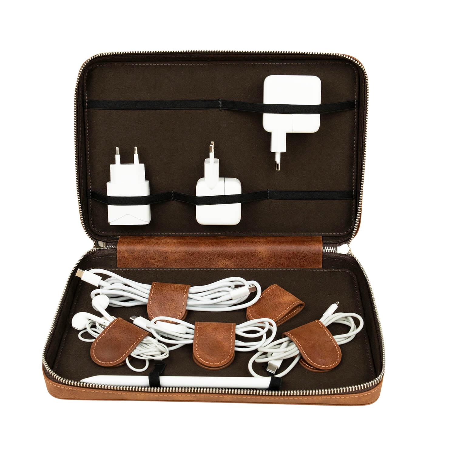 - Crafted from premium leather, it offers a sleek and durable solution for keeping chargers, cables, and other accessories neatly secured.