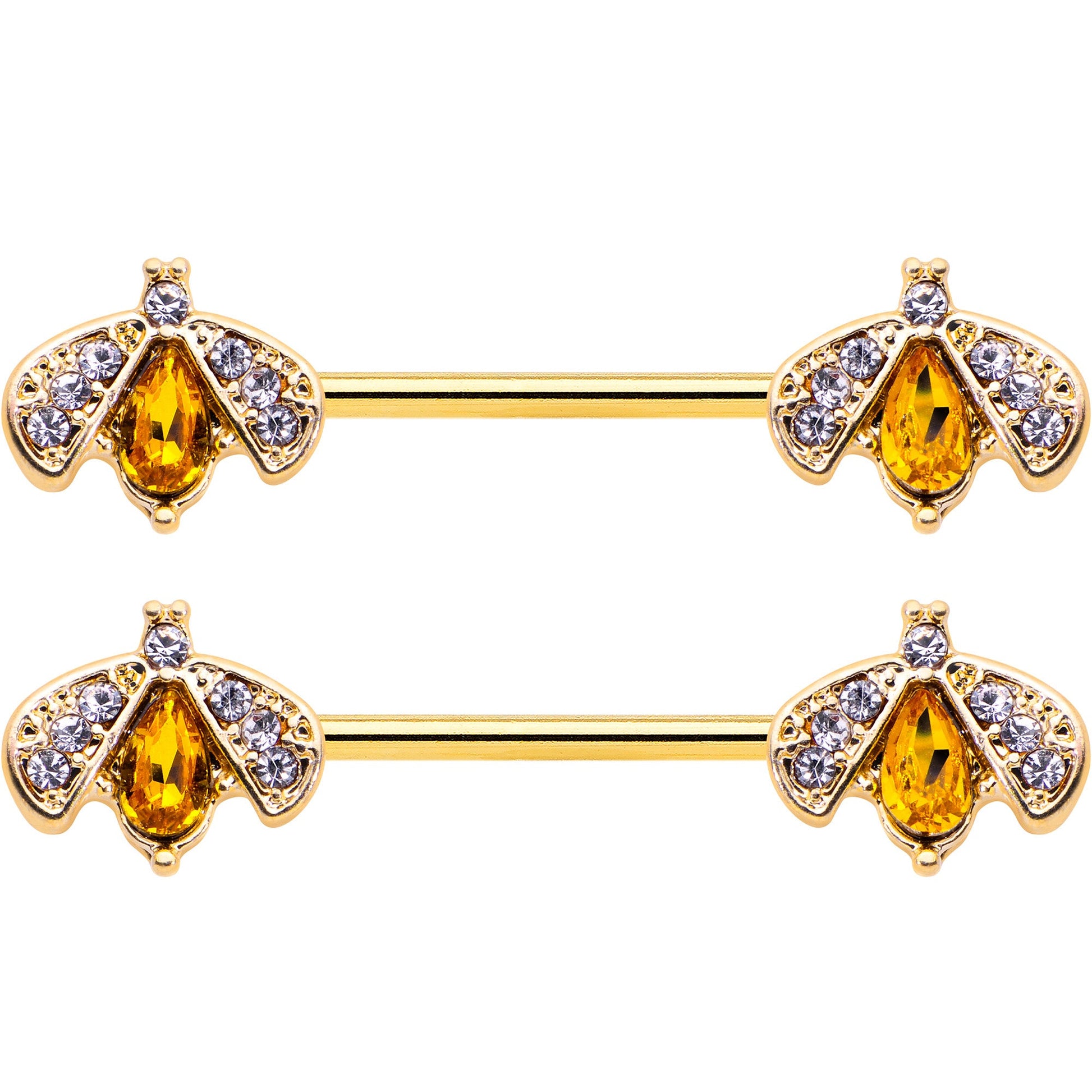 14G 9/16 Yellow Gem Gold Tone Fashion Bug Barbell Nipple Ring Set