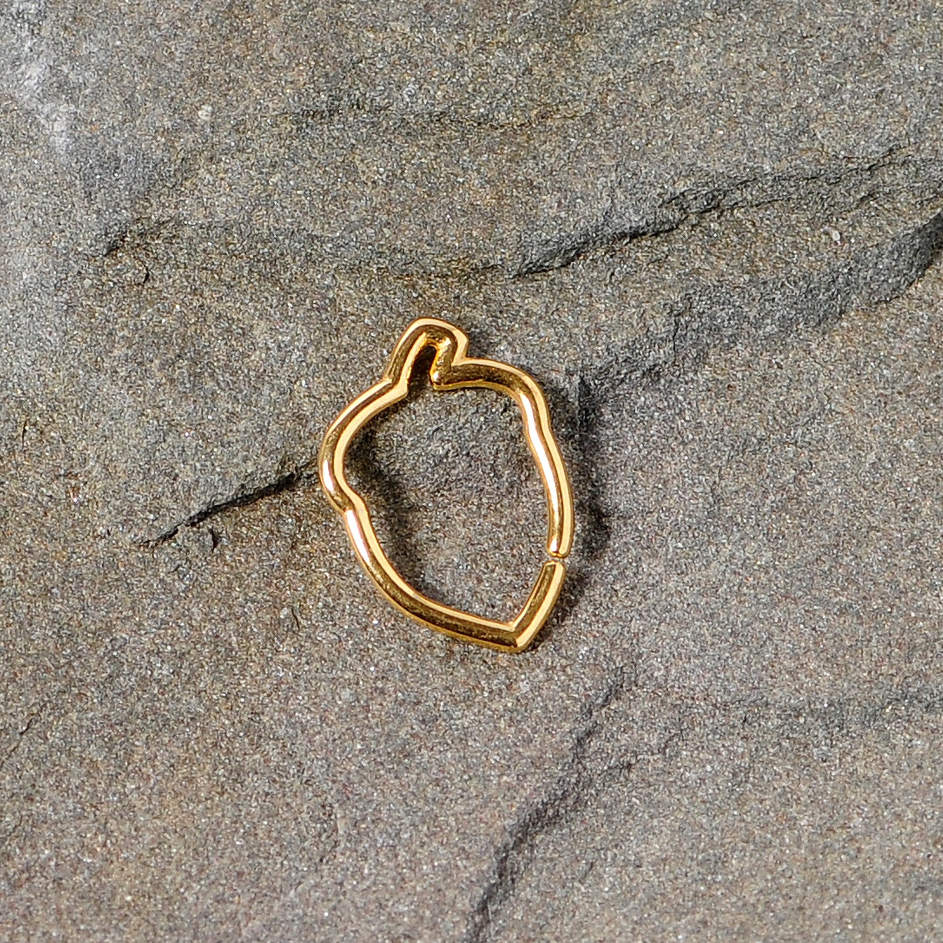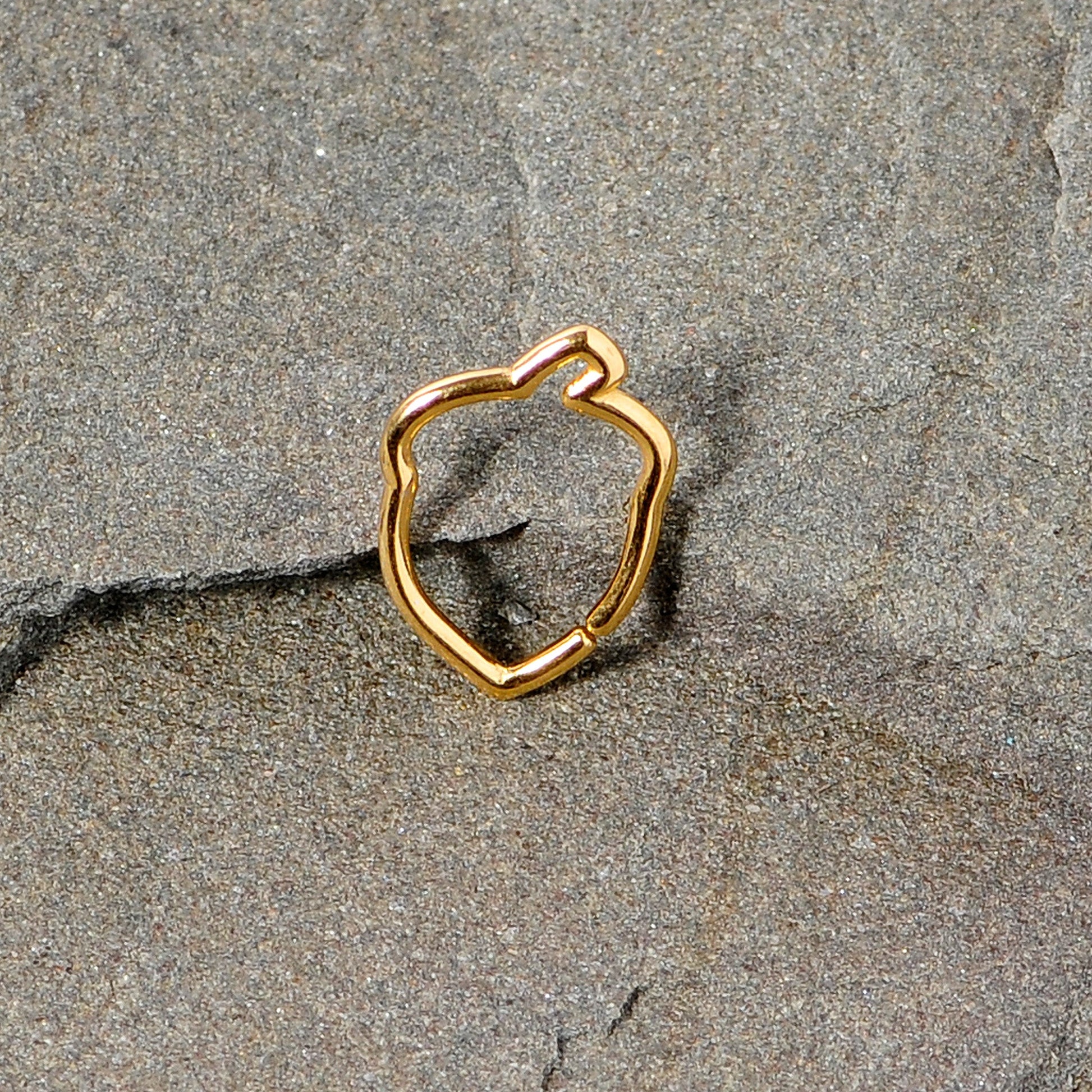 This 16 gauge cartilage ring is all about fall! It's made with 10mm gold tone PVD over 316L surgical grade stainless steel, shaped like an acorn fallen right from the tree, and is super easy to insert and remove. Just give it a light twist, insert it into your piercing and gently bend it closed. And this is a feature you'll love because it works wonderfully in multiple cartilage piercings including the helix and tragus.Specifications