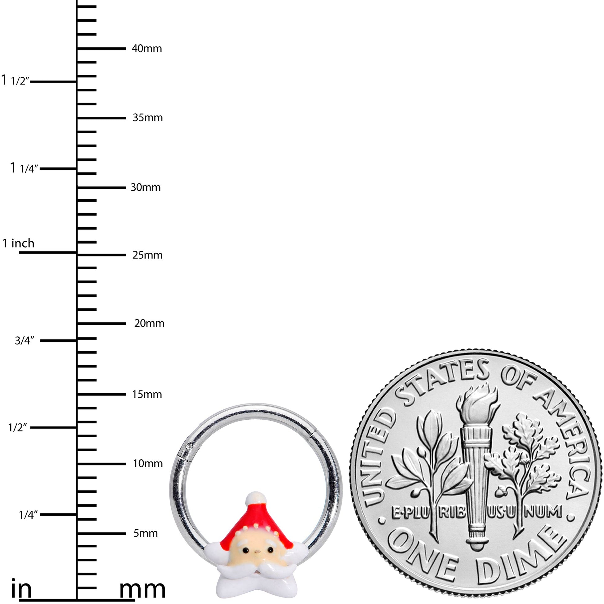 Santa's in town and loaned his long, flowing beard to this 16 gauge cartilage jewelry! It's made with a 10mm durable 316L surgical grade stainless steel hinged circular ring. It features a Santa's face charm with his long white beard flowing out to each side. Santa's wearing his traditional pointy red hat for a thoroughly festive look. It also features a non-removable hinged segment that makes insertion and removal a snap. And you can sport this Santa in multiple piercings including septum, tragus, and helix piercings. If you're feeling the holiday spirit, show it off with this spirited Santa tragus ring!Specifications